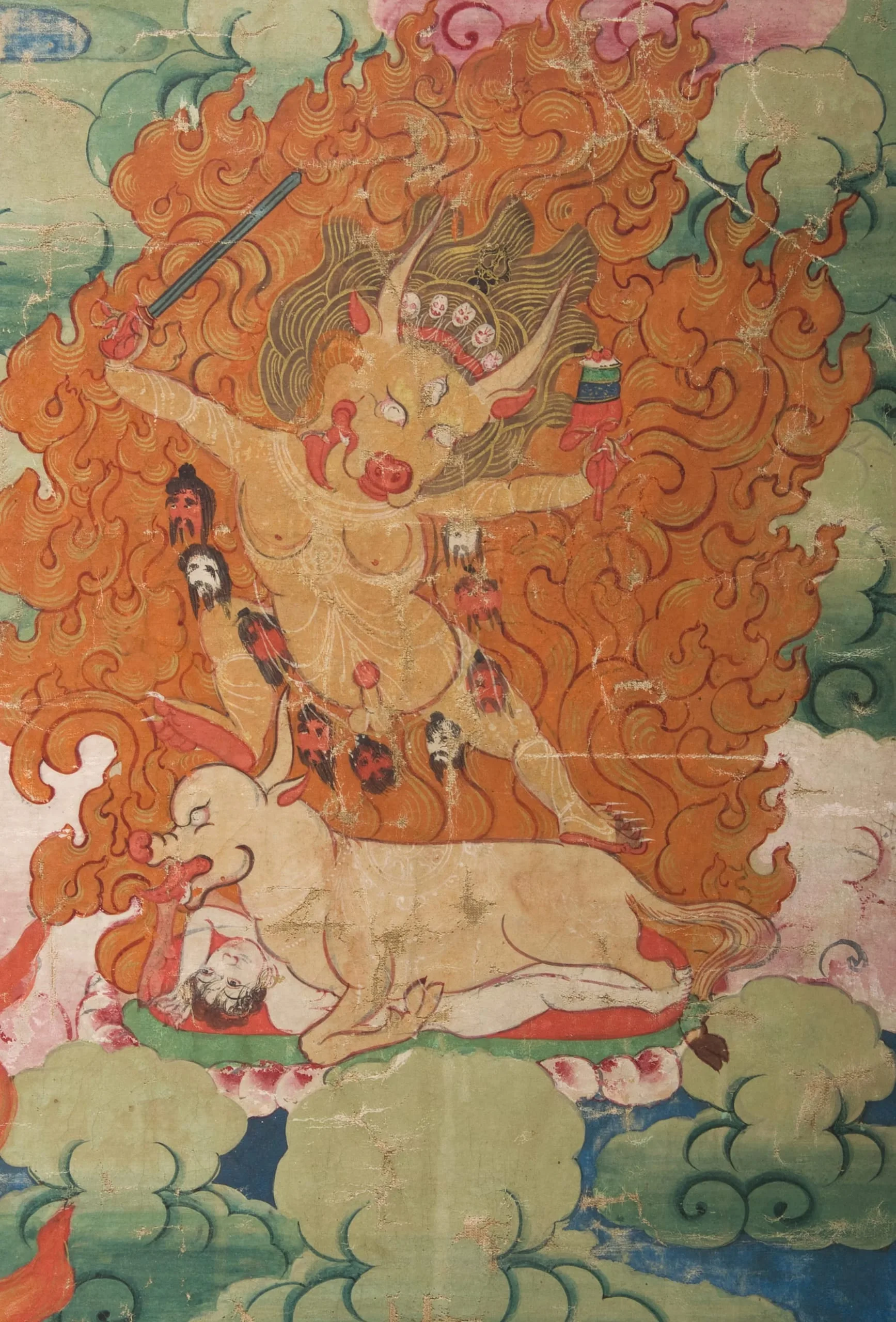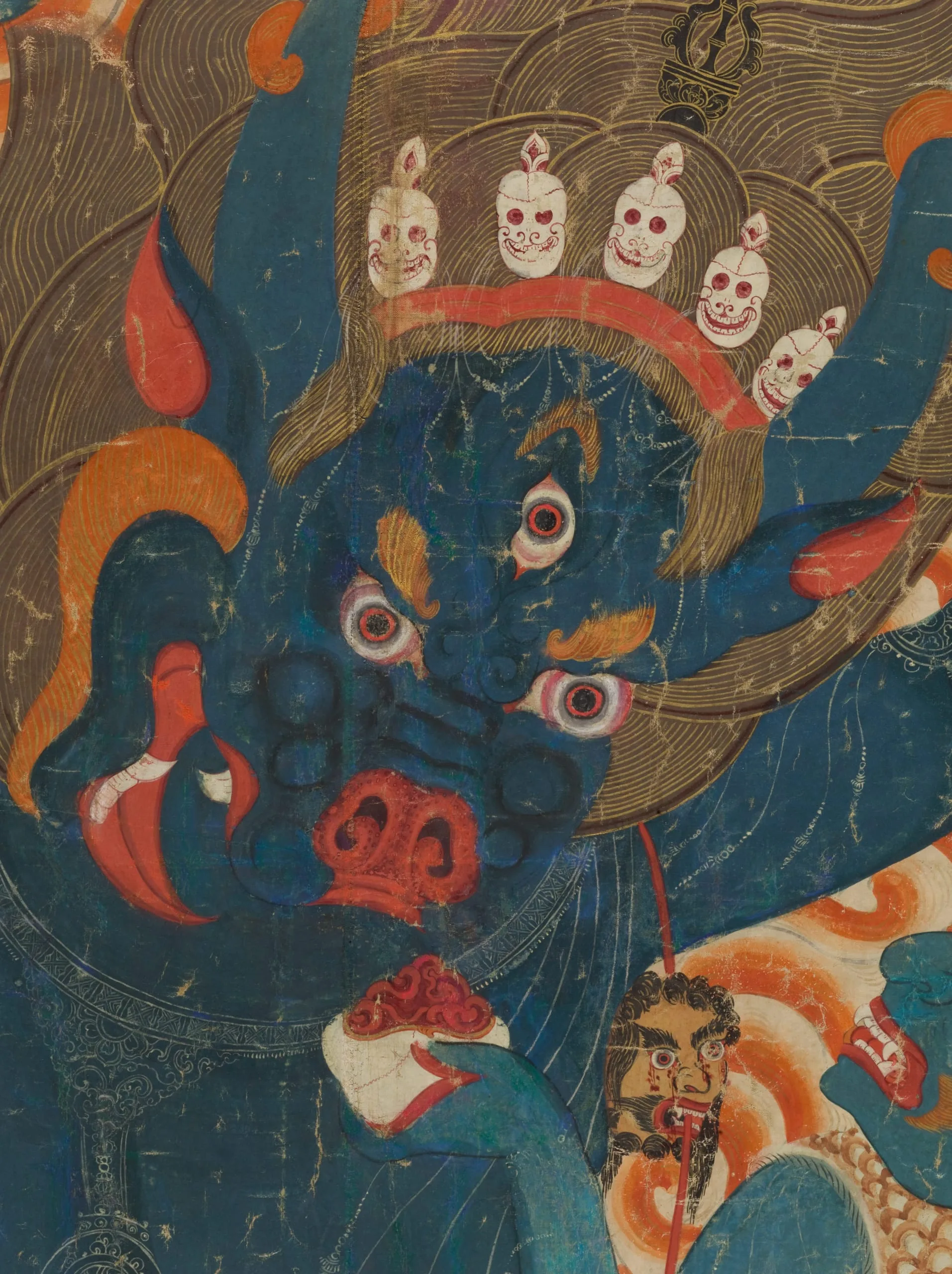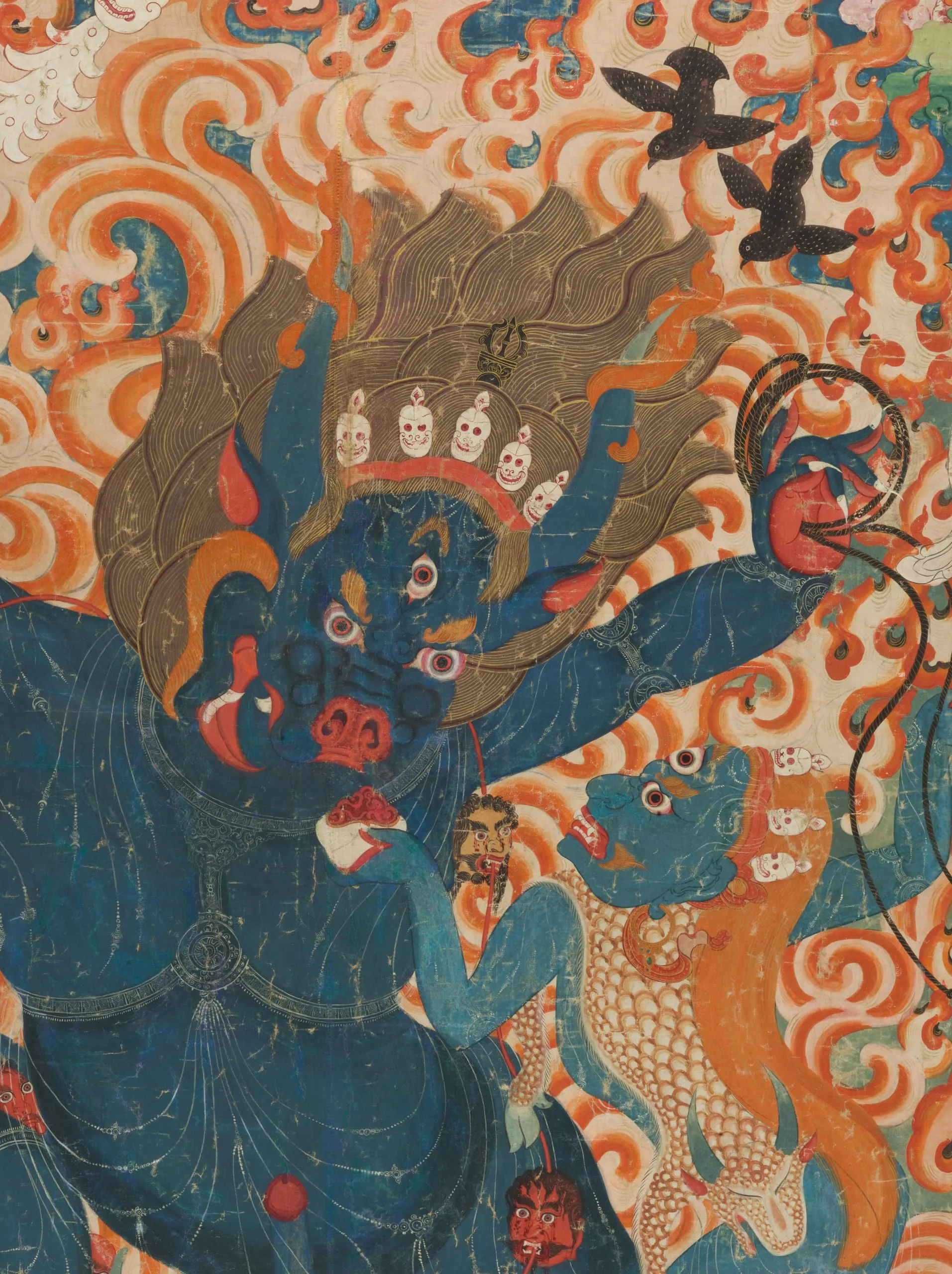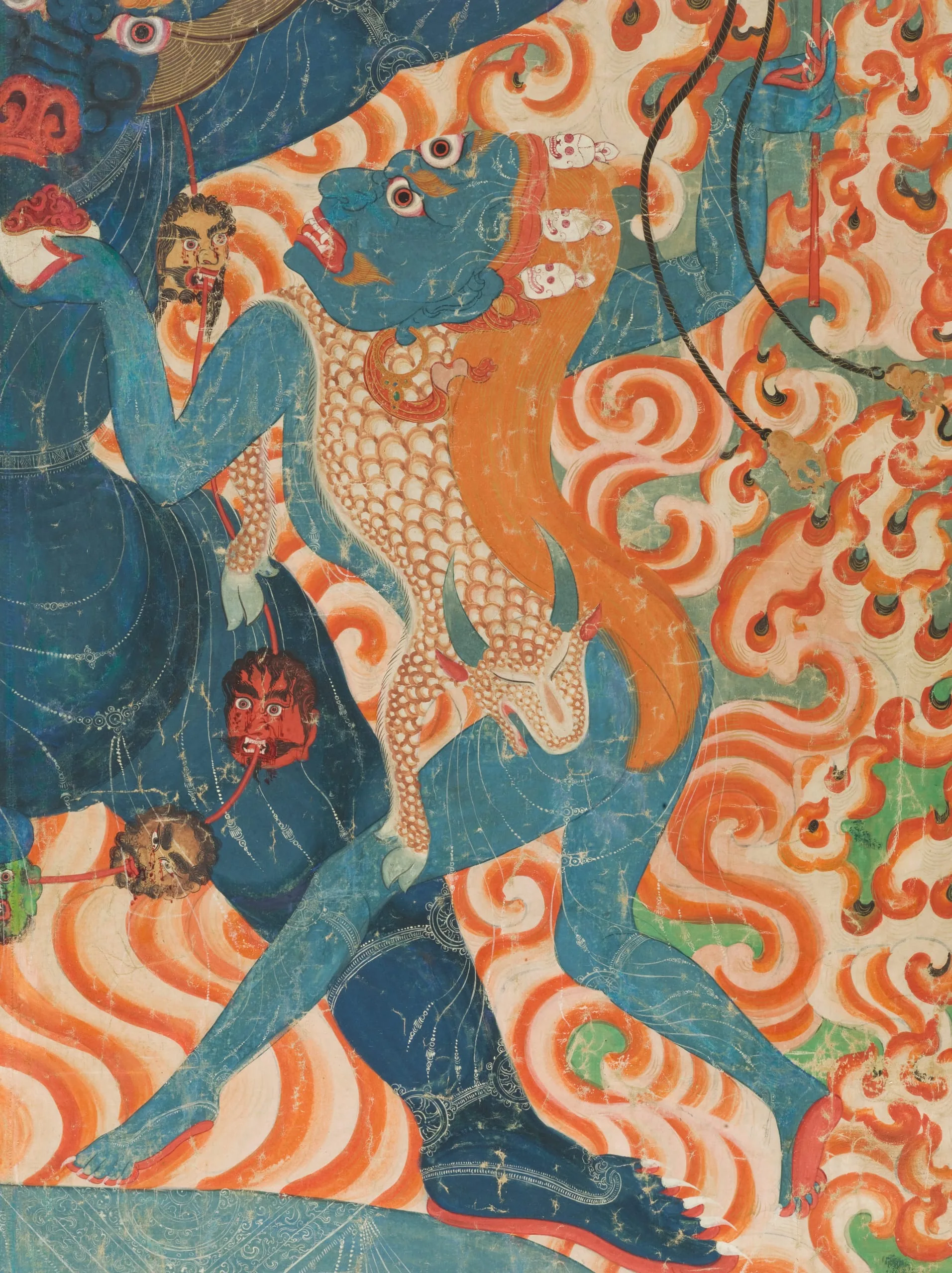 At 94 ½ inches in height, this is one of the largest Tibetan ceremonial paintings (thangka) outside of Tibet. It depicts the Vajrayana (esoteric) Buddhist protective deities Yama and his sister Yami. Yama is the Lord of the Underworld who judges the soul at the gates of hell. As a Dharmaraja (King of the [Buddhist] Law), Yama is a major member of the Dharmapalas (Protectors of the [Buddhist] Law), who are believed to defend Buddhism and its teachings, and destroy the hindrances of its followers. He is specifically depicted here in his conceptual form of the Outer Yamaraja (Lord of Death), who protects Buddhists and monasteries from droughts, bandits, and other evils. See also M.84.104.