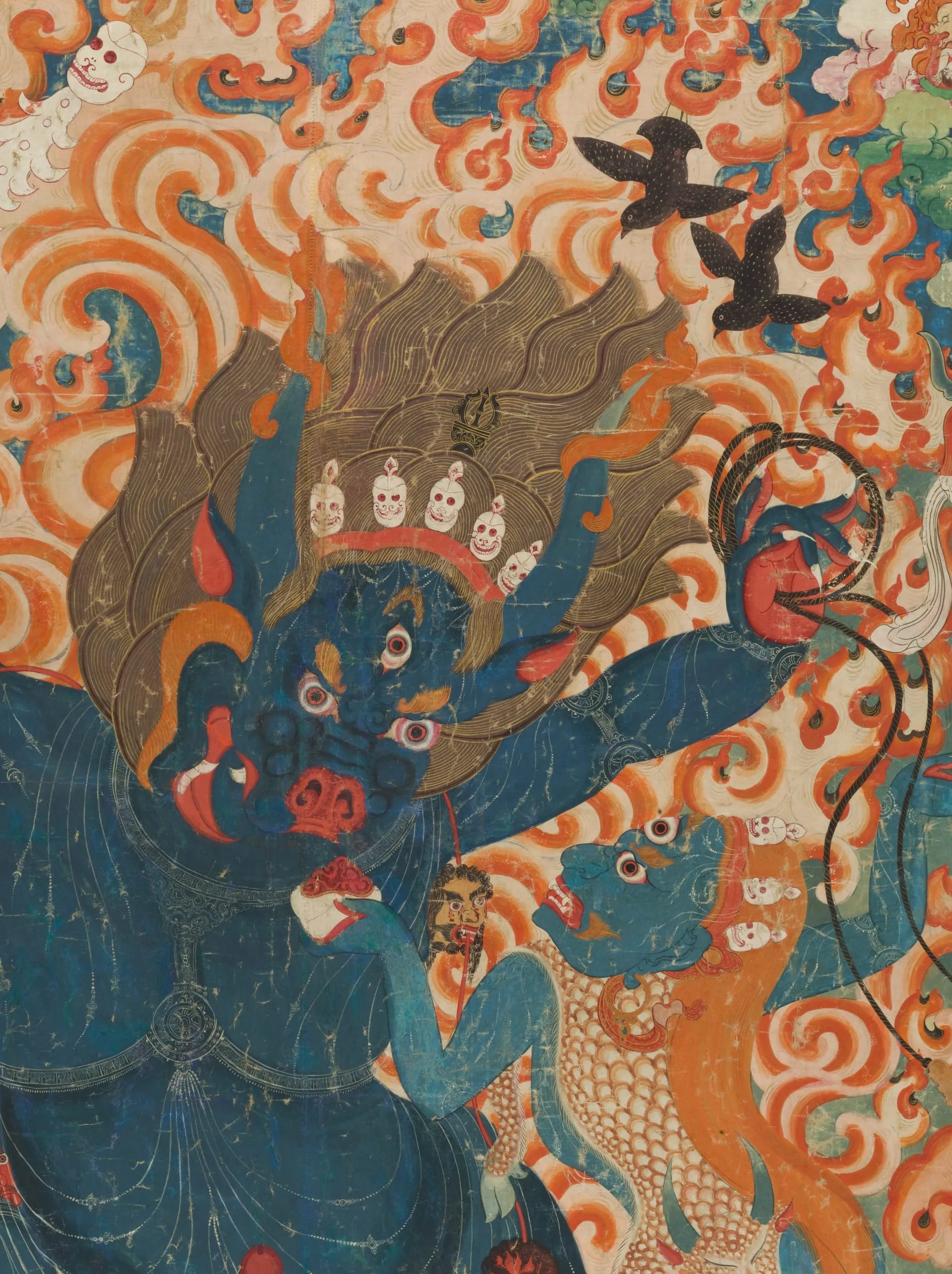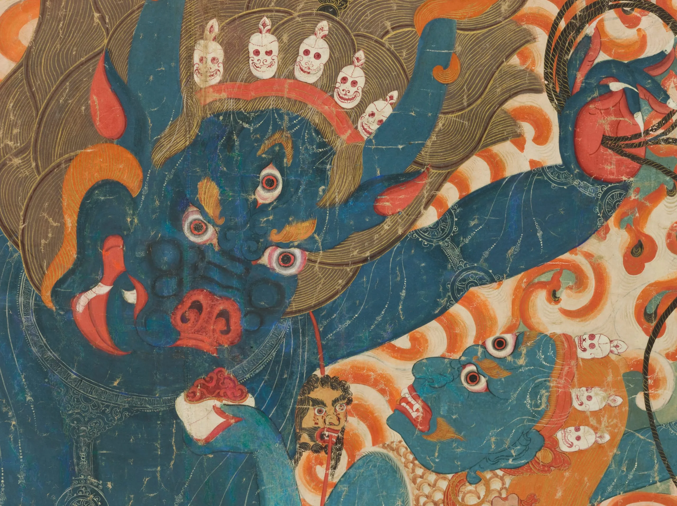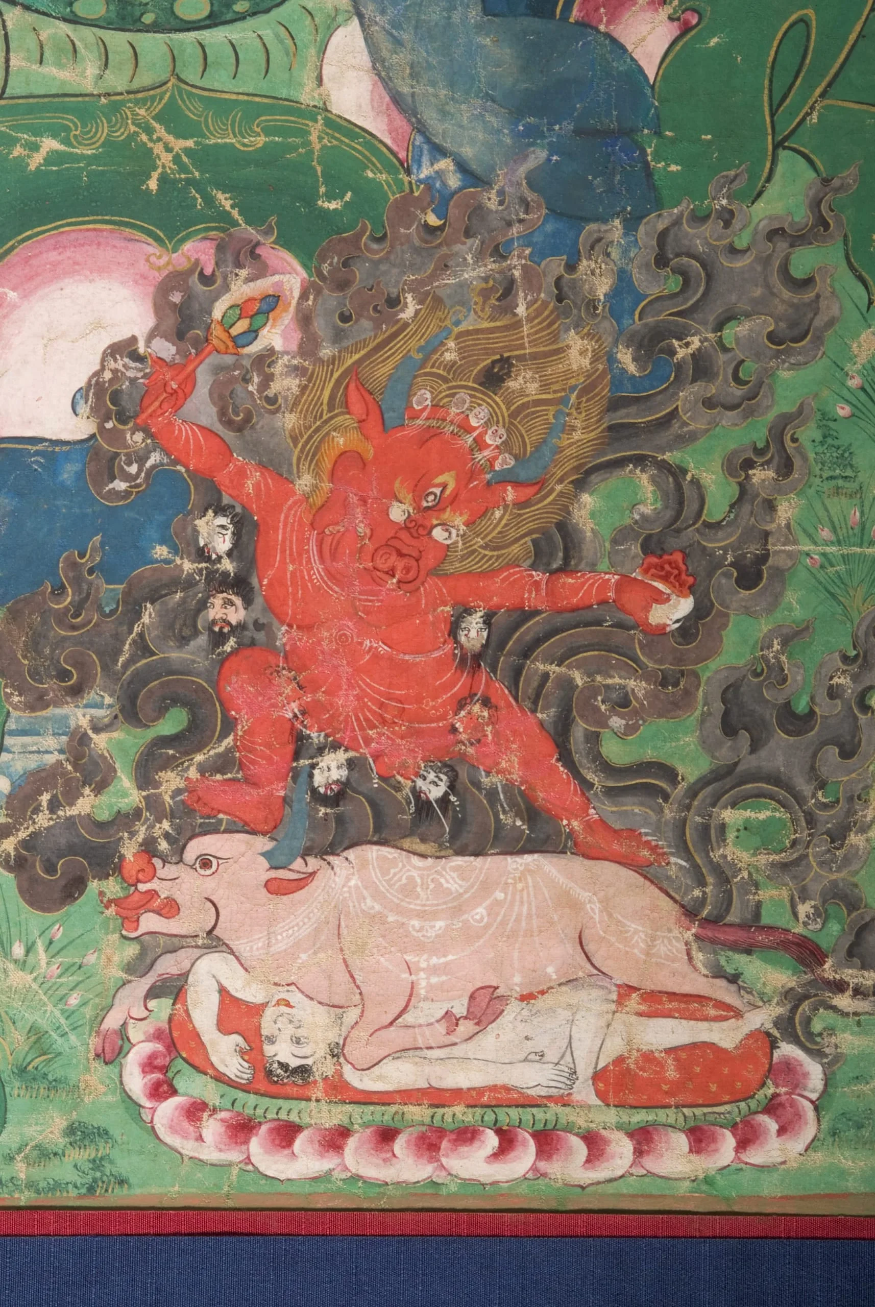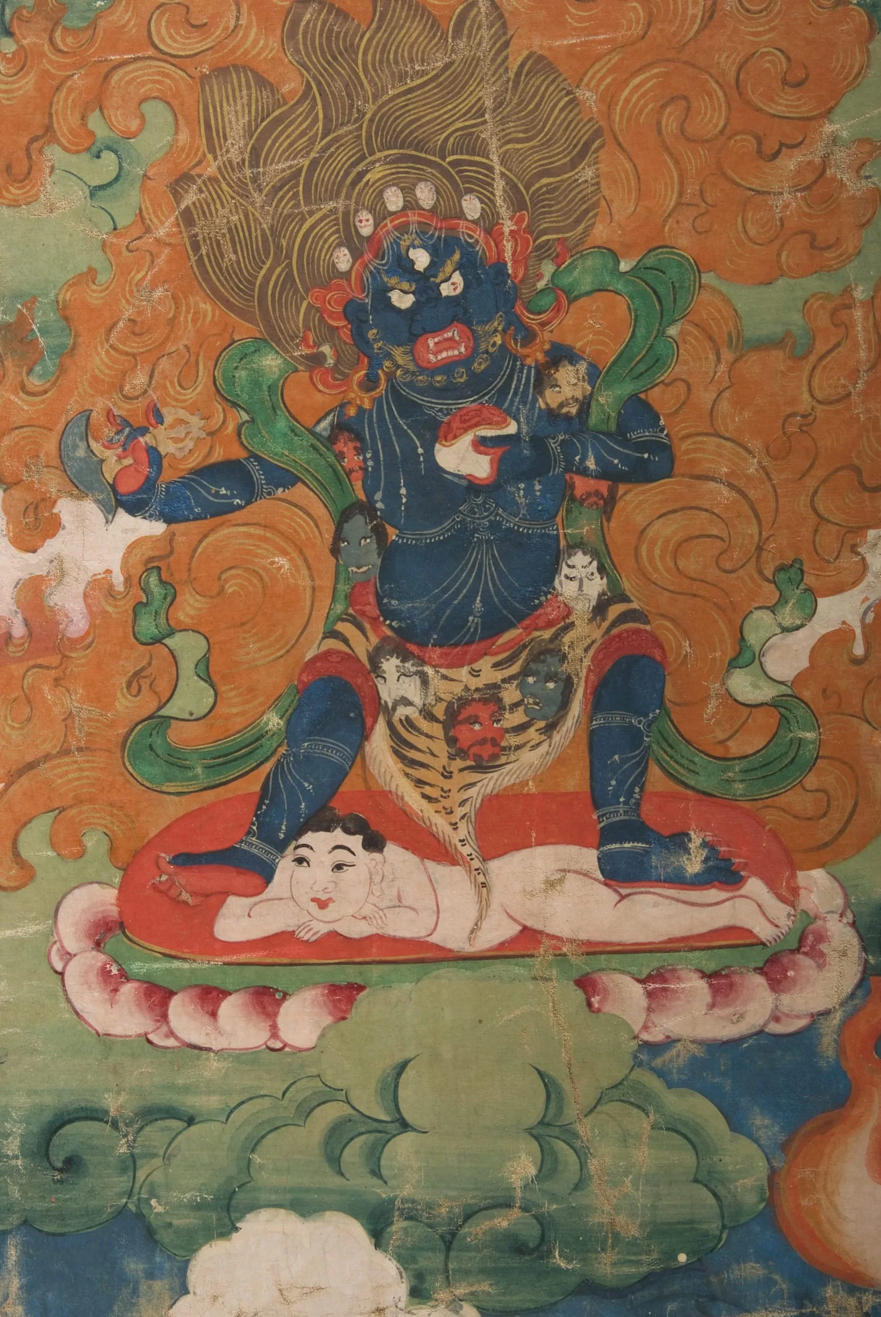 At 94 ½ inches in height, this is one of the largest Tibetan ceremonial paintings (thangka) outside of Tibet. It depicts the Vajrayana (esoteric) Buddhist protective deities Yama and his sister Yami. Yama is the Lord of the Underworld who judges the soul at the gates of hell. As a Dharmaraja (King of the [Buddhist] Law), Yama is a major member of the Dharmapalas (Protectors of the [Buddhist] Law), who are believed to defend Buddhism and its teachings, and destroy the hindrances of its followers. He is specifically depicted here in his conceptual form of the Outer Yamaraja (Lord of Death), who protects Buddhists and monasteries from droughts, bandits, and other evils. See also M.84.104.