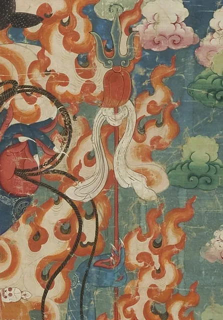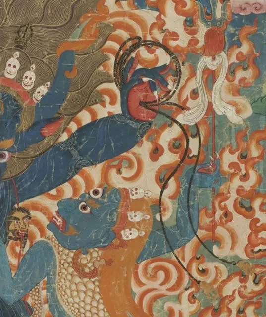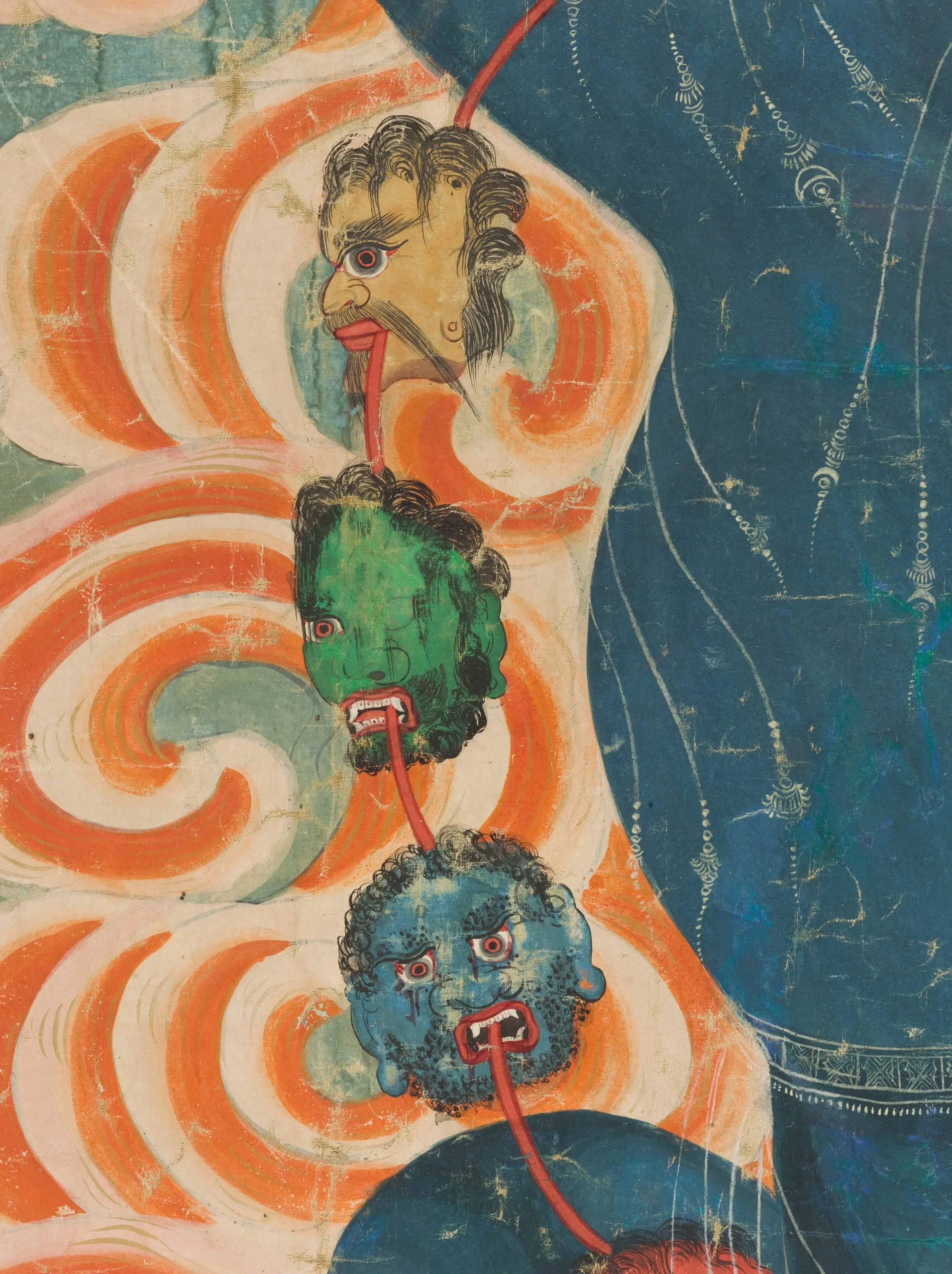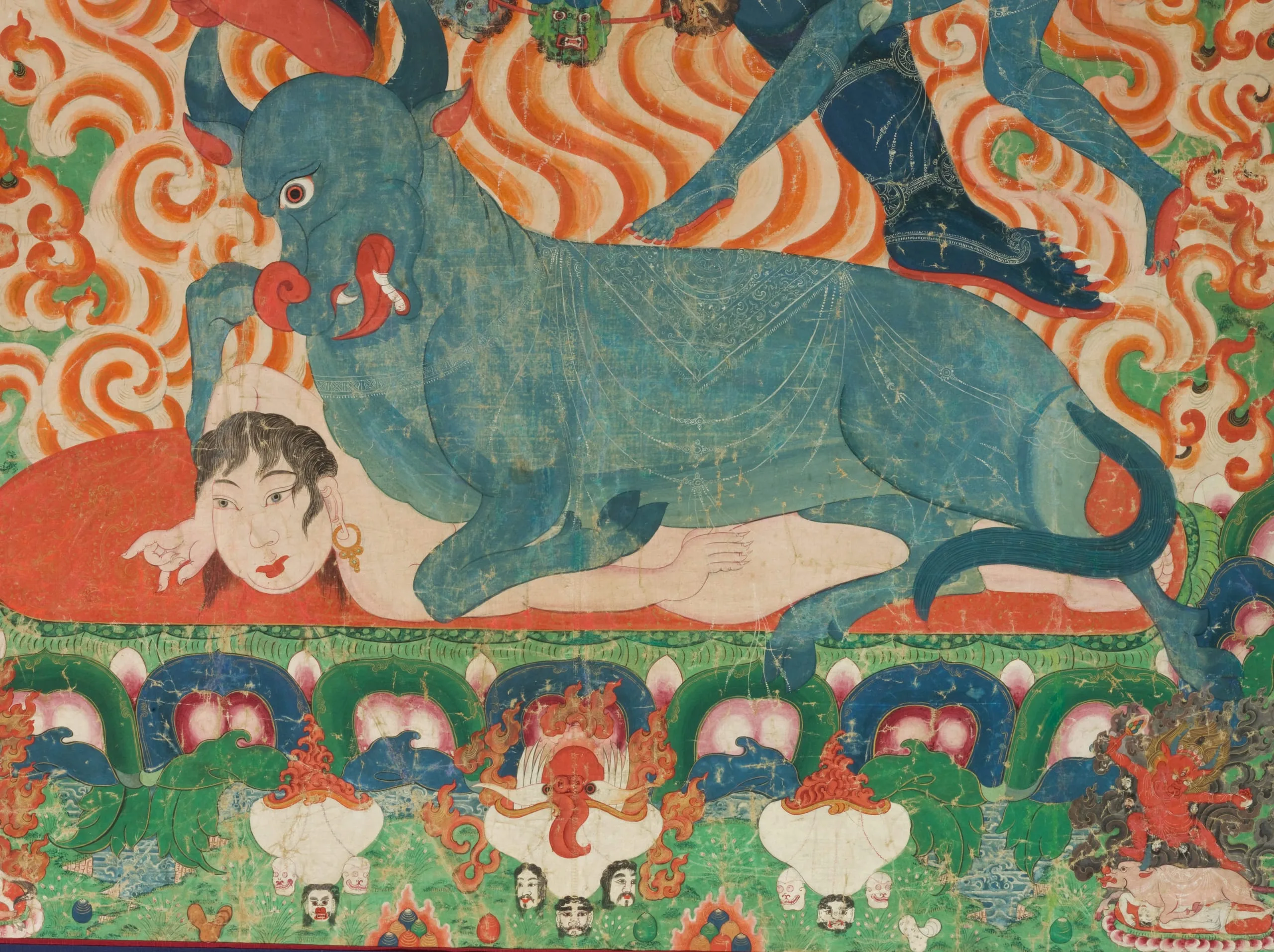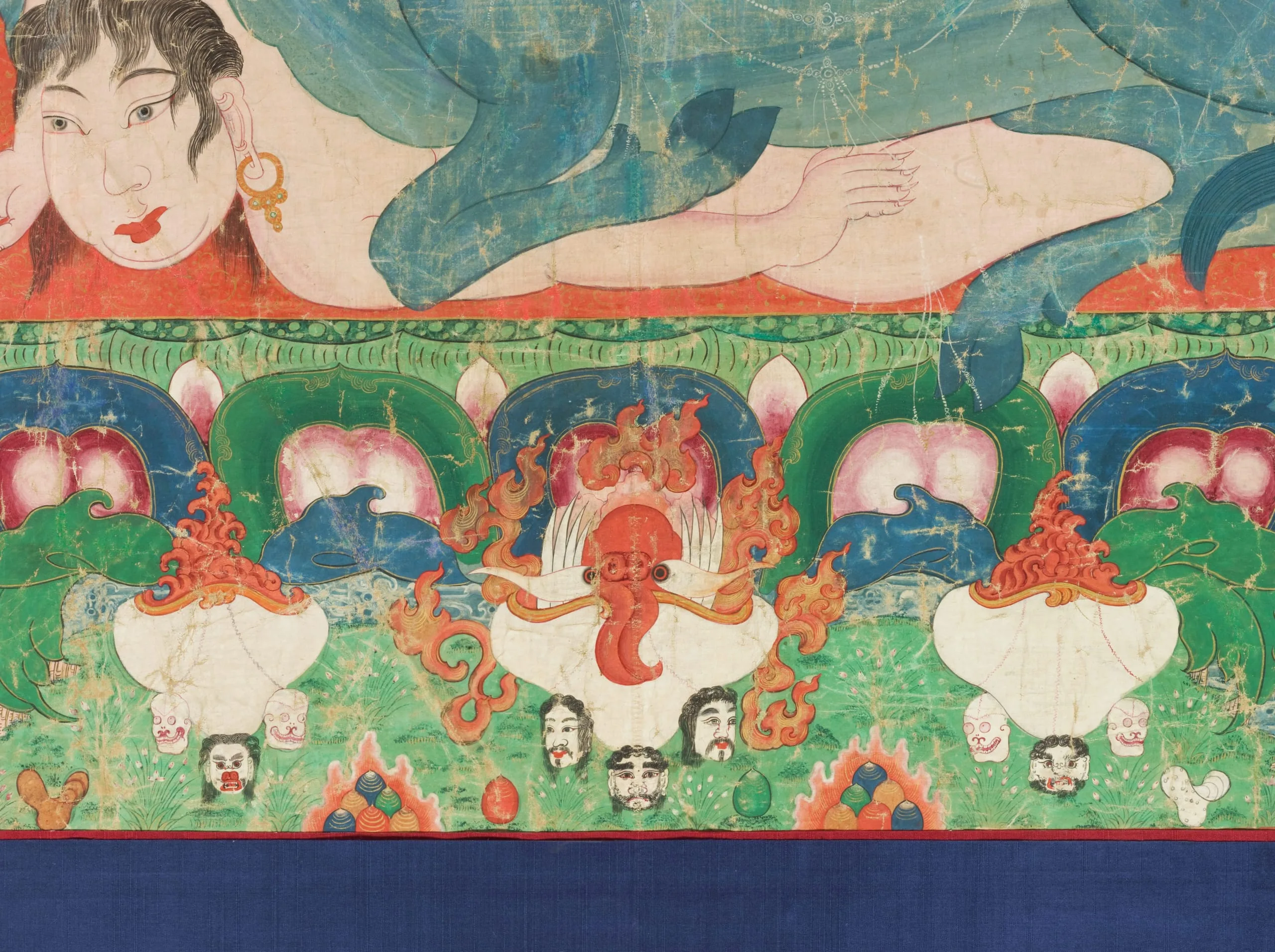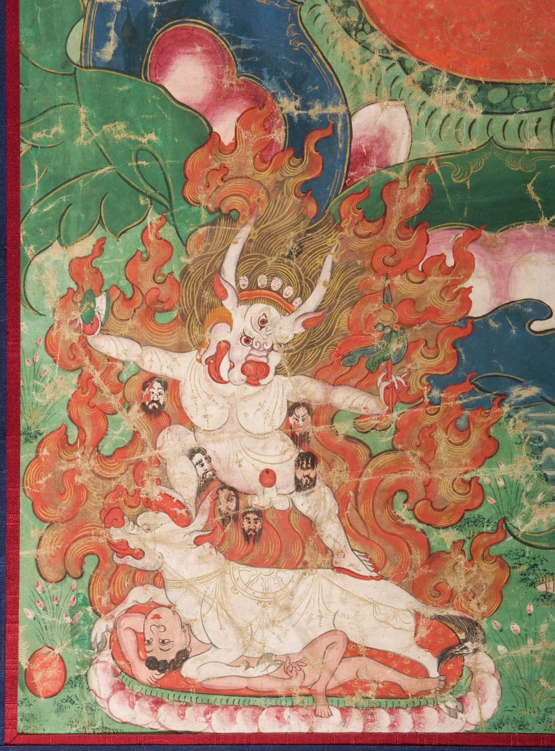 At 94 ½ inches in height, this is one of the largest Tibetan ceremonial paintings (thangka) outside of Tibet. It depicts the Vajrayana (esoteric) Buddhist protective deities Yama and his sister Yami. Yama is the Lord of the Underworld who judges the soul at the gates of hell. As a Dharmaraja (King of the [Buddhist] Law), Yama is a major member of the Dharmapalas (Protectors of the [Buddhist] Law), who are believed to defend Buddhism and its teachings, and destroy the hindrances of its followers. He is specifically depicted here in his conceptual form of the Outer Yamaraja (Lord of Death), who protects Buddhists and monasteries from droughts, bandits, and other evils. See also M.84.104.