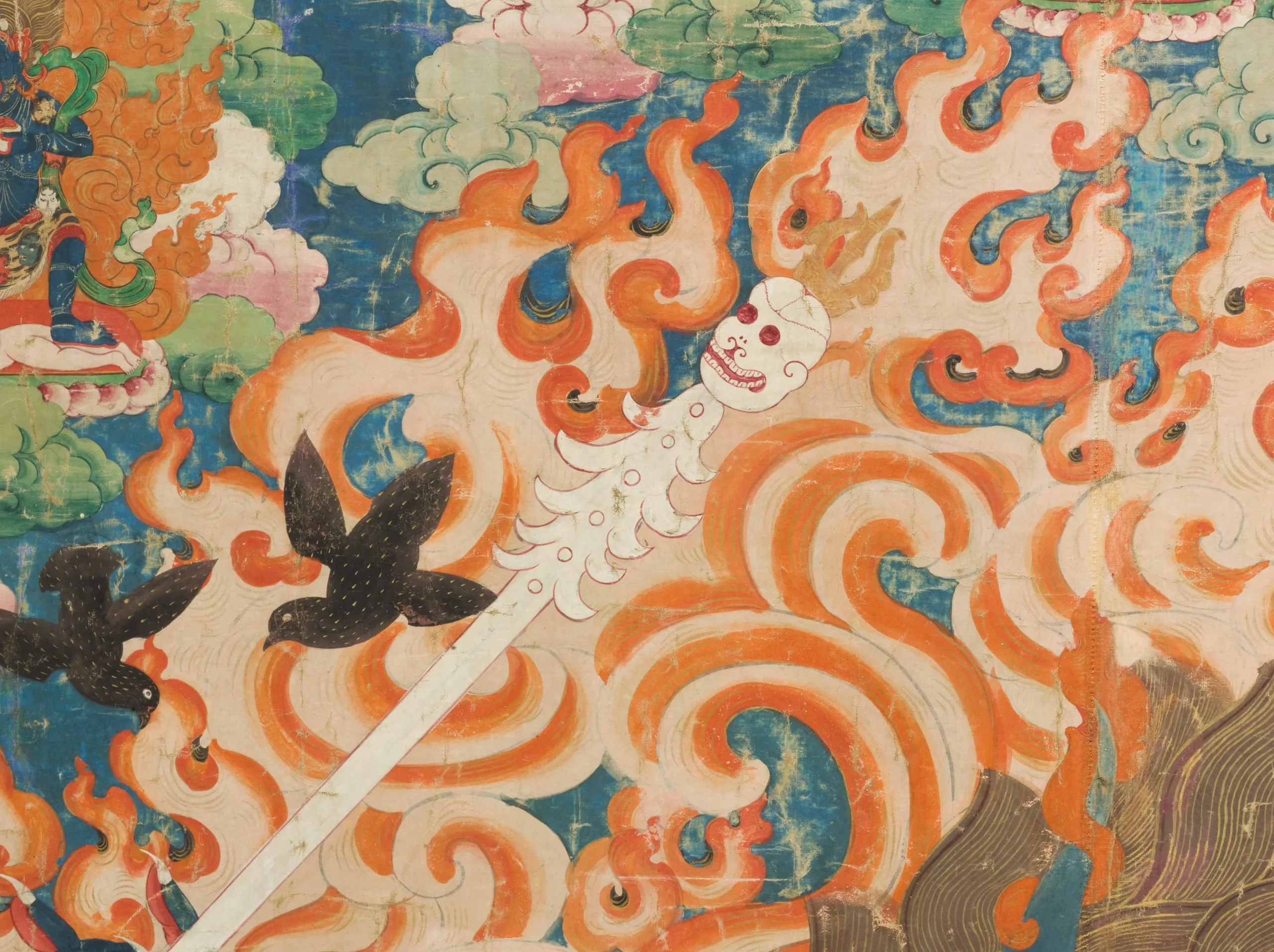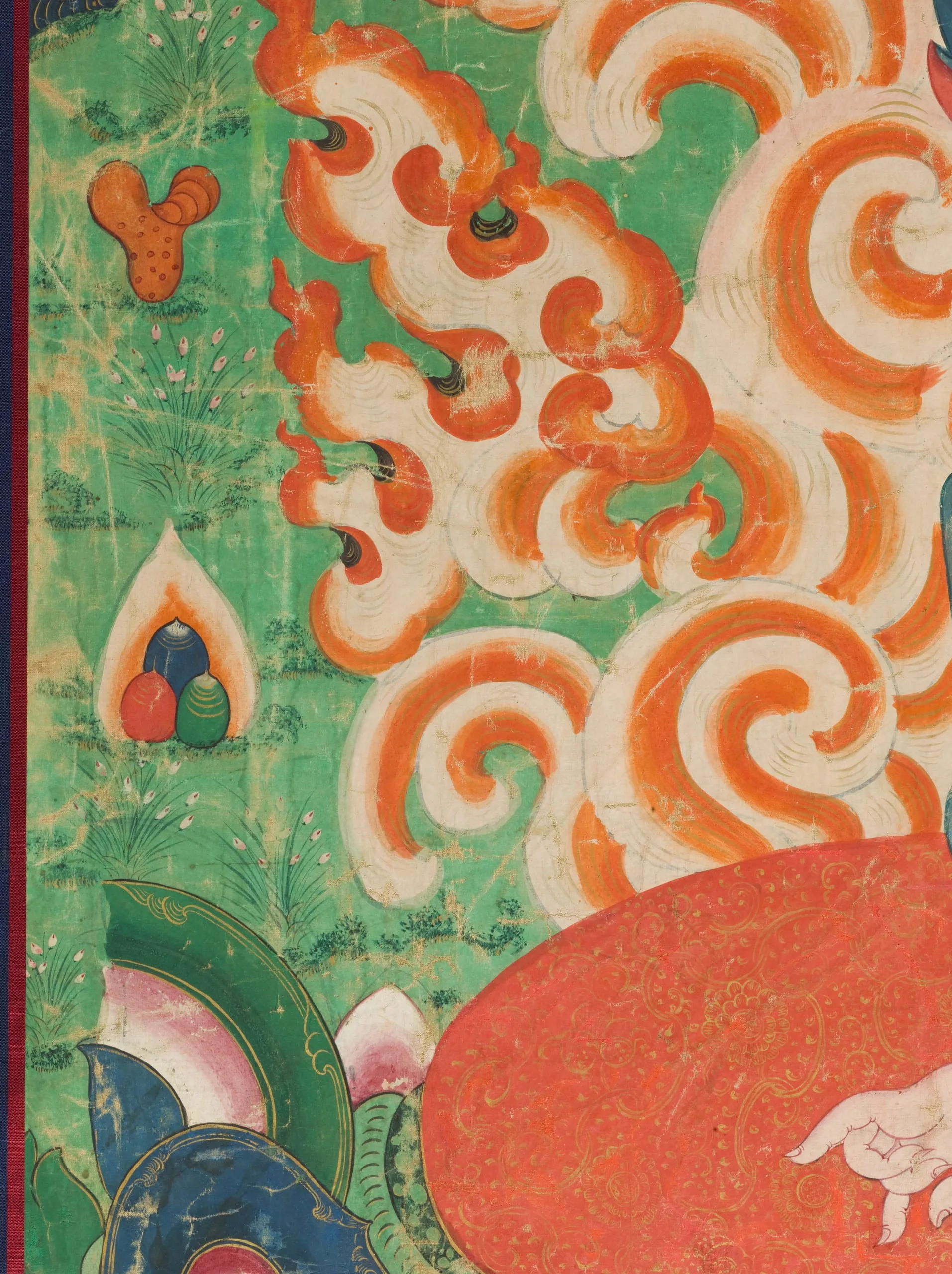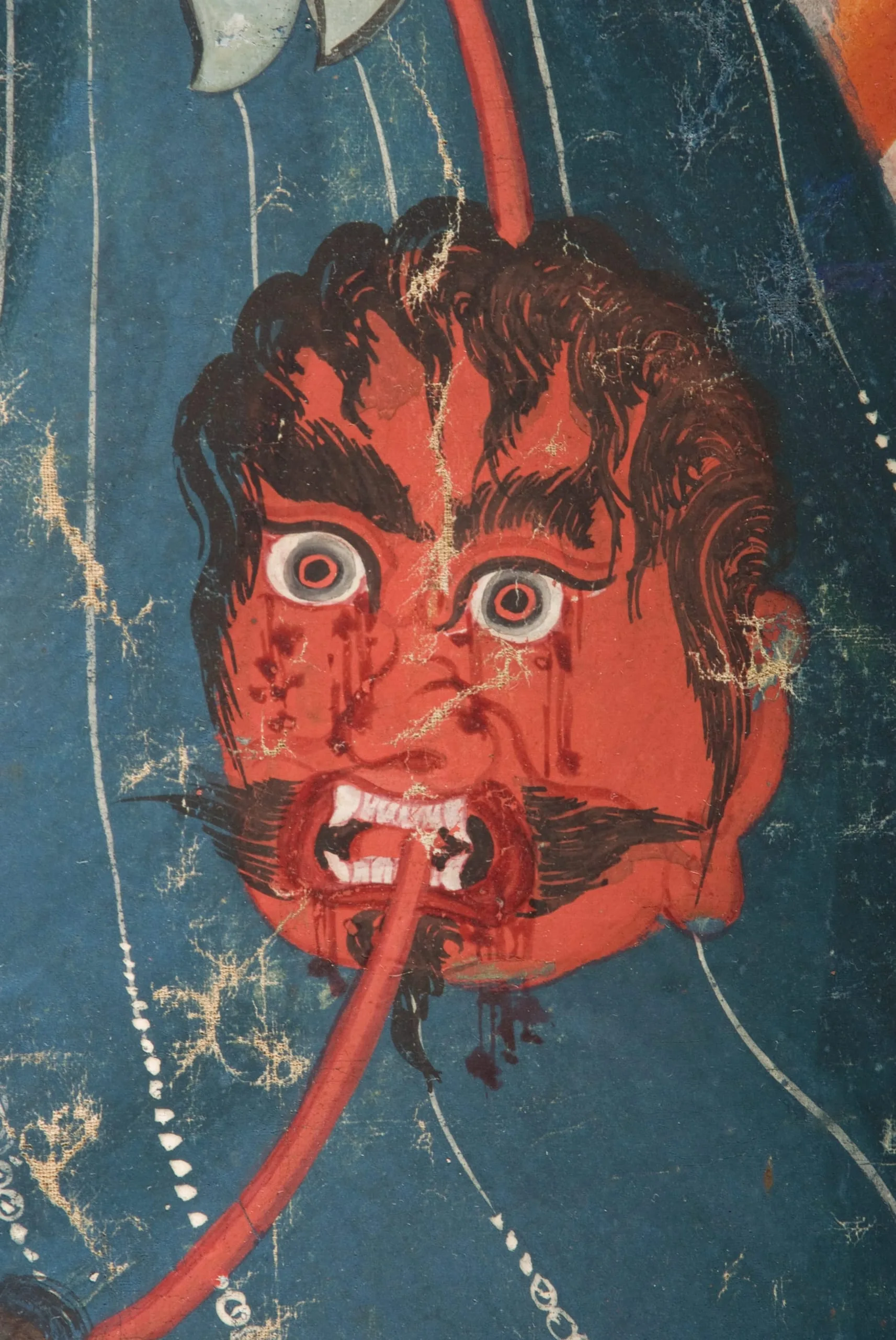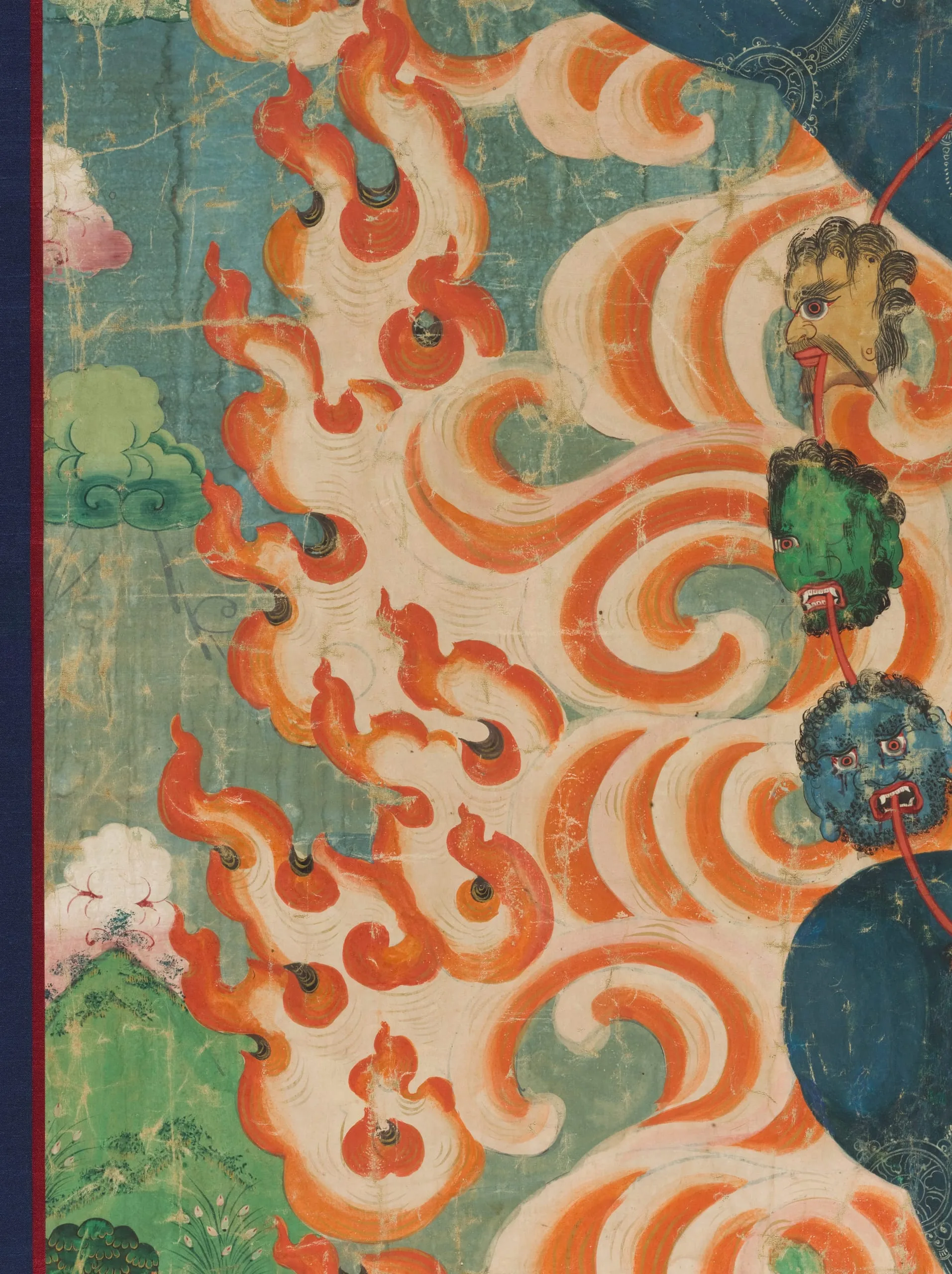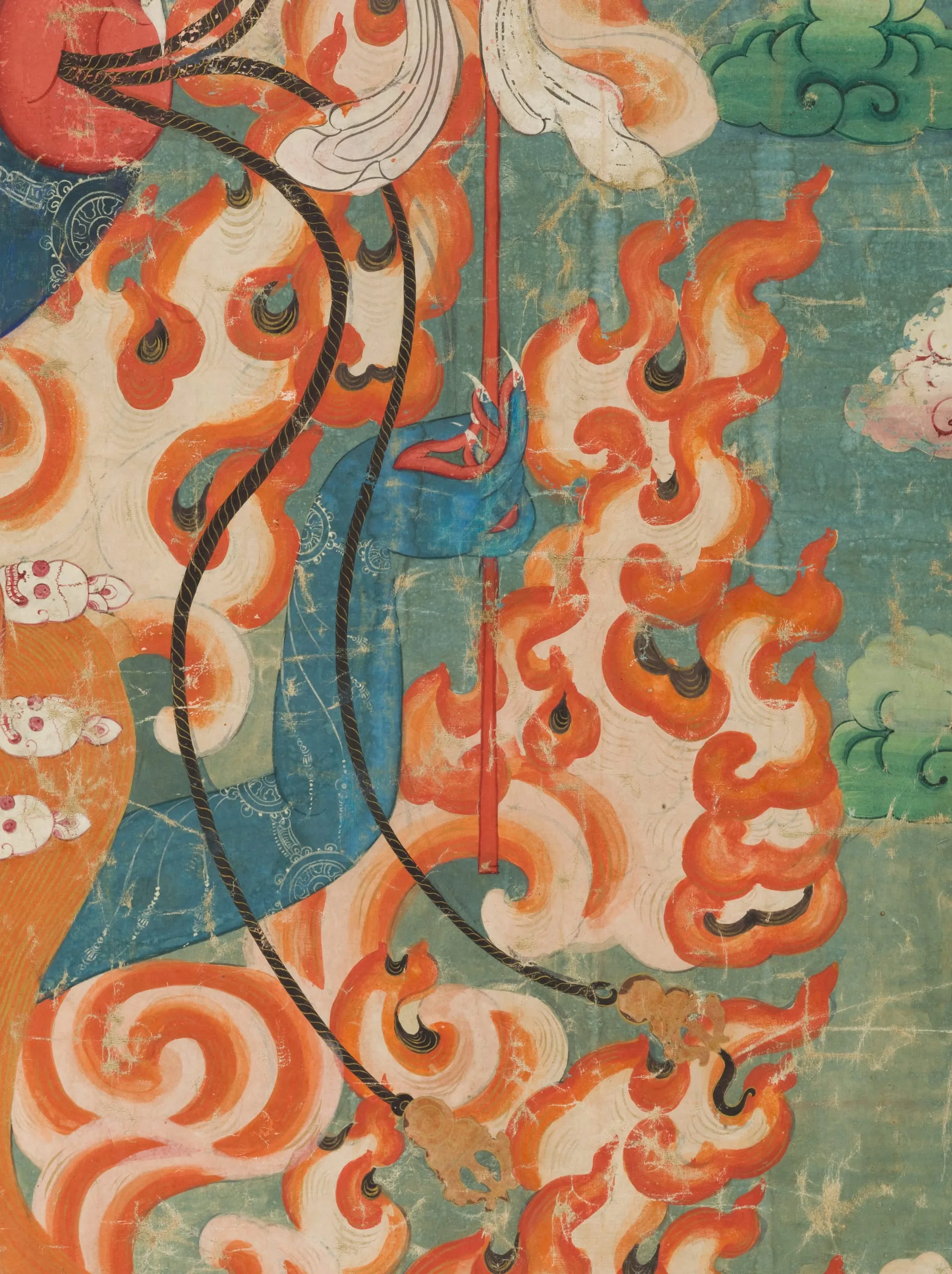 The macabre imagery of Yama and Yami serves to terrify those who might seek to harm Buddhists. Yama is thus represented in a fierce form surrounded by brilliant areola of billowing flames. He has a buffalo’s head and wears a diadem of skulls, bone ornaments, and a long garland of severed heads. He carries a chastising staff and a noose to bind souls. Yami, equally horrific, offers him a skullcup full of demon-blood elixir. They stand aggressively on a blue bull, which crushes a female figure symbolic of ignorant life. Beneath them are ritual offerings of multicolored gems and skullcups filled with gruesome body parts and organs intended to remind devotees of the impermanence of one’s physical body. Five small images of Yama, each a different color representing a distinct conceptual form, appear in the four corners and apex of the painting. The green landscape along the bottom and sides of the thangka are characteristic of eastern Tibetan painting.