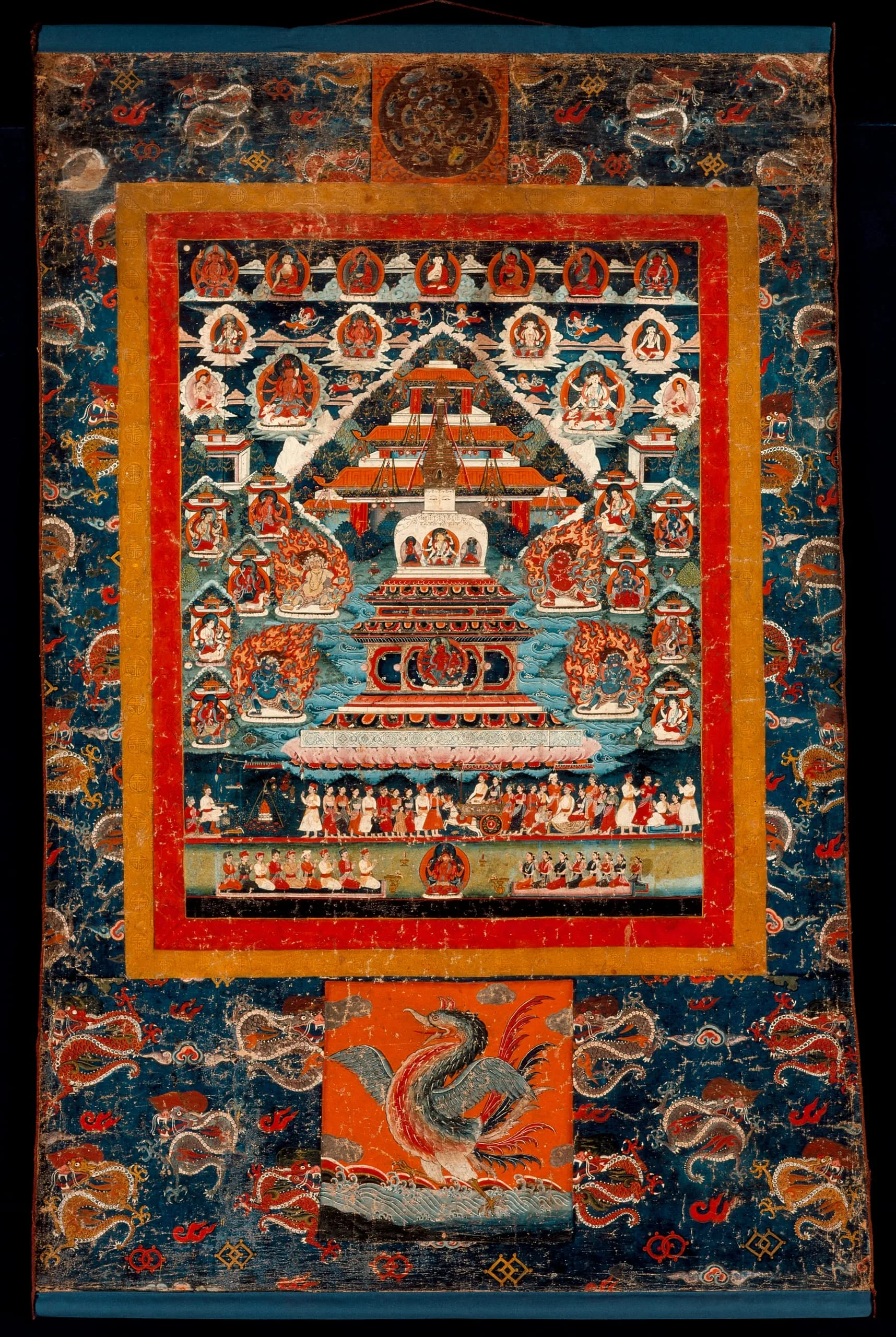 Invariably the Newari merchants would commission and consecrate thangkas such as this fine example in Tibetan monasteries and bring them back to Nepal as souvenirs. The style of these paintings is Tibetan, but the subject matter is usually Nepalese.