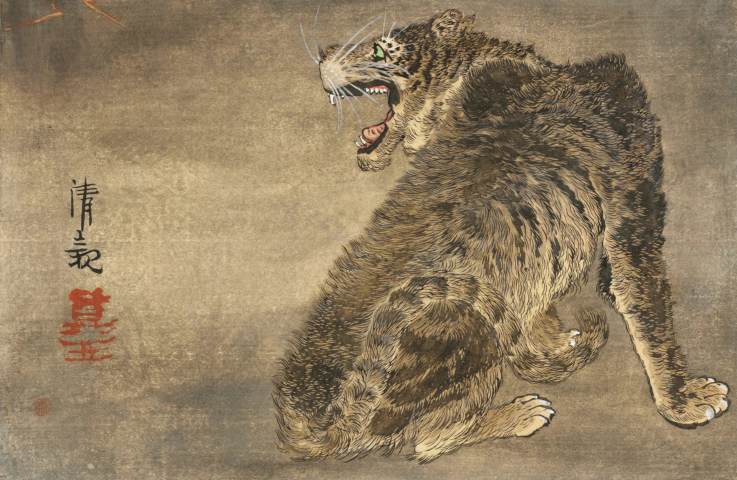 Woodblock print of a roaring tiger with open mouth and green eyes, body crouched, rendered in brown and amber tones against a mottled gold-gray background, with black East Asian script and red seals at left