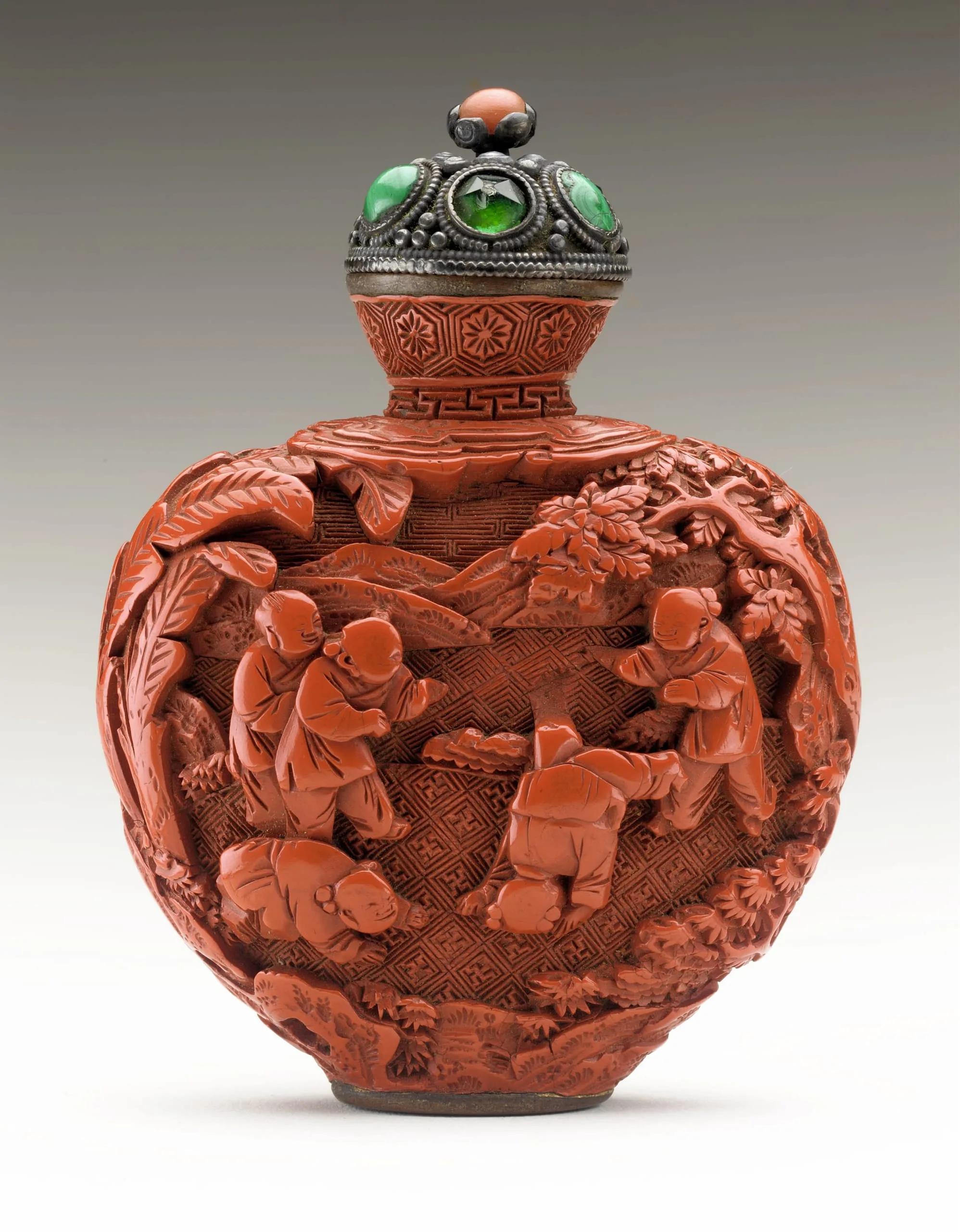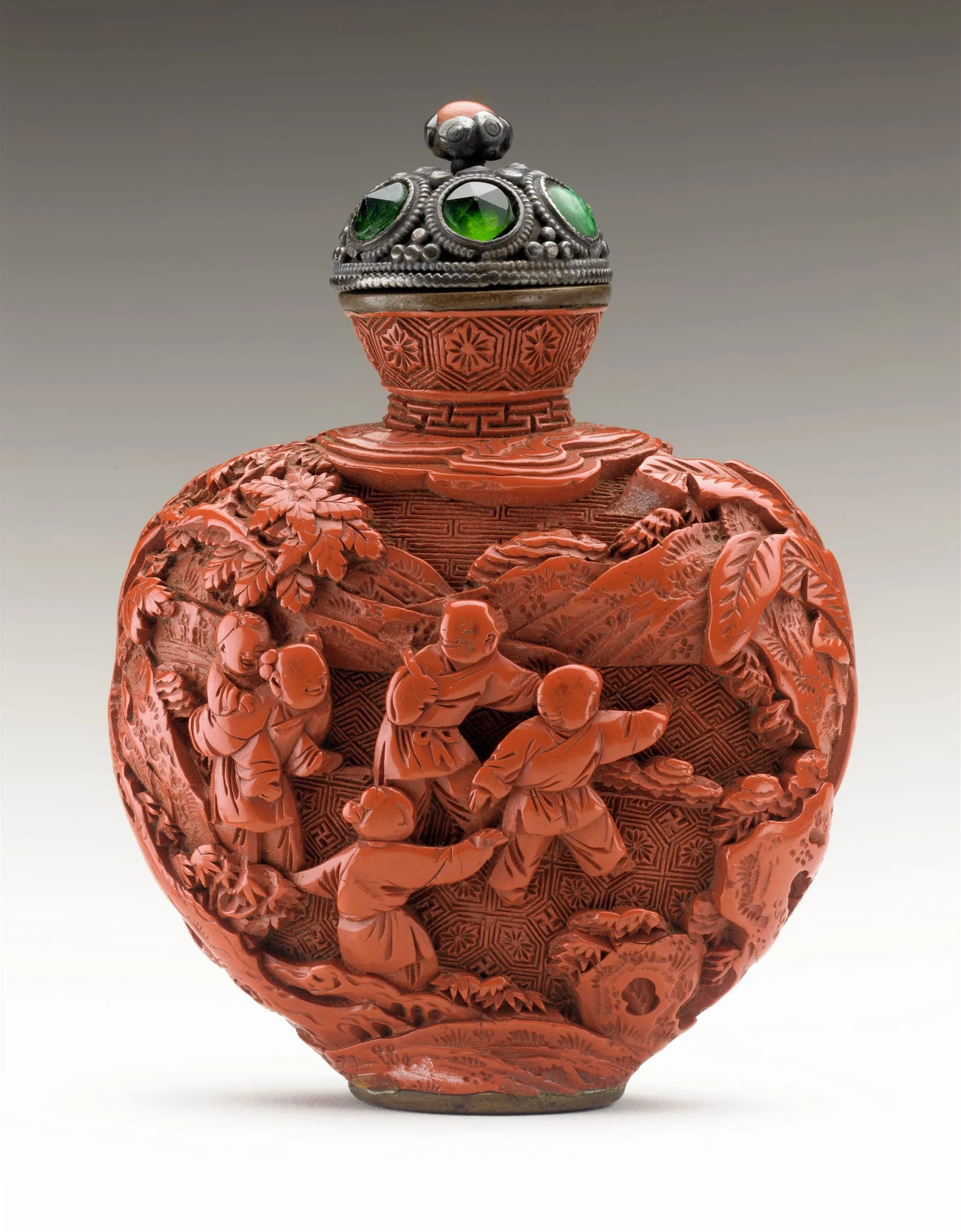 - Carved red lacquer on metal core, with metal stopper inset with lapus lazuli and glass