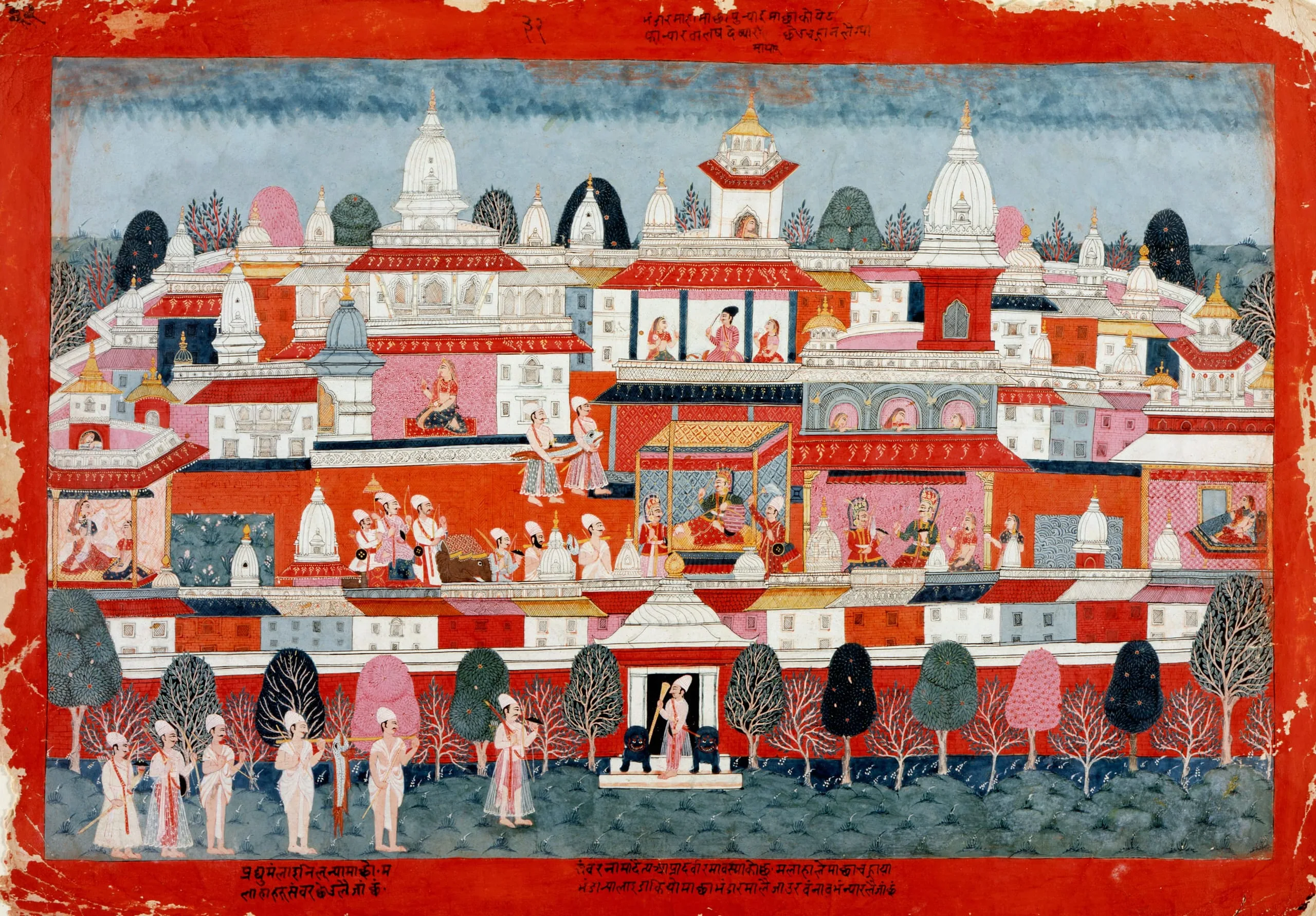 This painting, and its series mates M.72.3.1 and AC1999.127.2, are from a dispersed Bhagavata Purana of more than 100 illustrations. The series is distinctive for its aerial perspective of temples and palaces in the Kathmandu Valley.