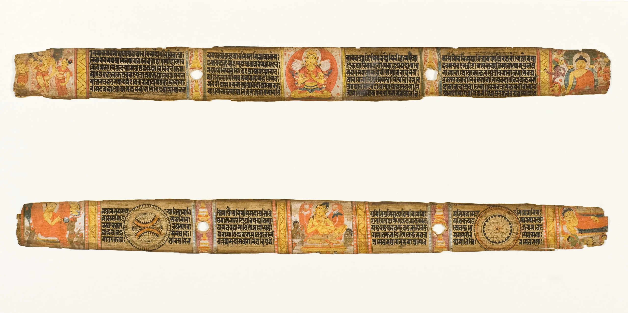 Dharanisamgraha were collections of charms considered to be particularly propitious for averting evil influences and physical afflictions of all kinds. This copy of the Dharanisamgraha is the only surviving illuminated manuscript commissioned by a Nepalese Buddhist during a visit to the revered monastic complex of Nalanda in eastern India. It is unusual in that scenes from the Buddha's life are rarely used to illustrate Dharanisamgraha texts, which are usually adorned with images of deities. The large roundels with lotus motifs mark the beginnings and ends of chapters.
