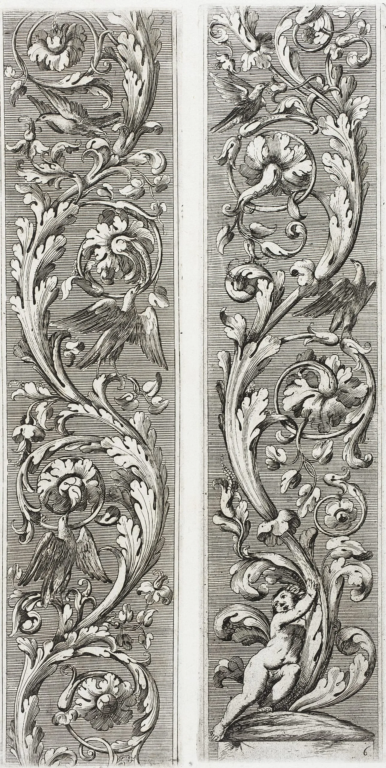Engraving of two vertical decorative panels with dense acanthus scrollwork, rosette flowers, birds in flight, and a small putto figure at the lower right