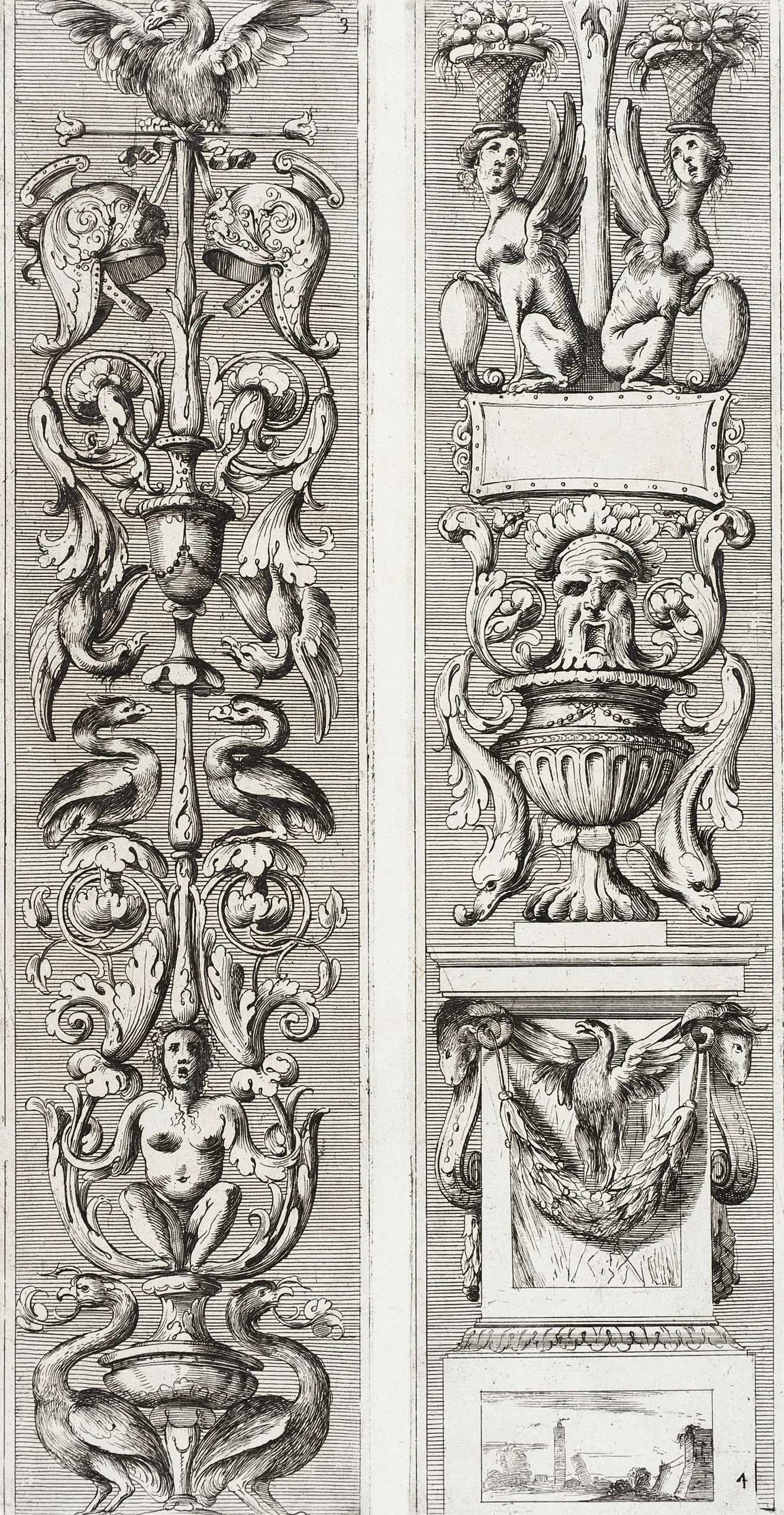 Engraving on cream paper showing two tall vertical ornamental panels with grotesque figures, acanthus scrollwork, griffins, serpents, urns, and hybrid human-plant forms