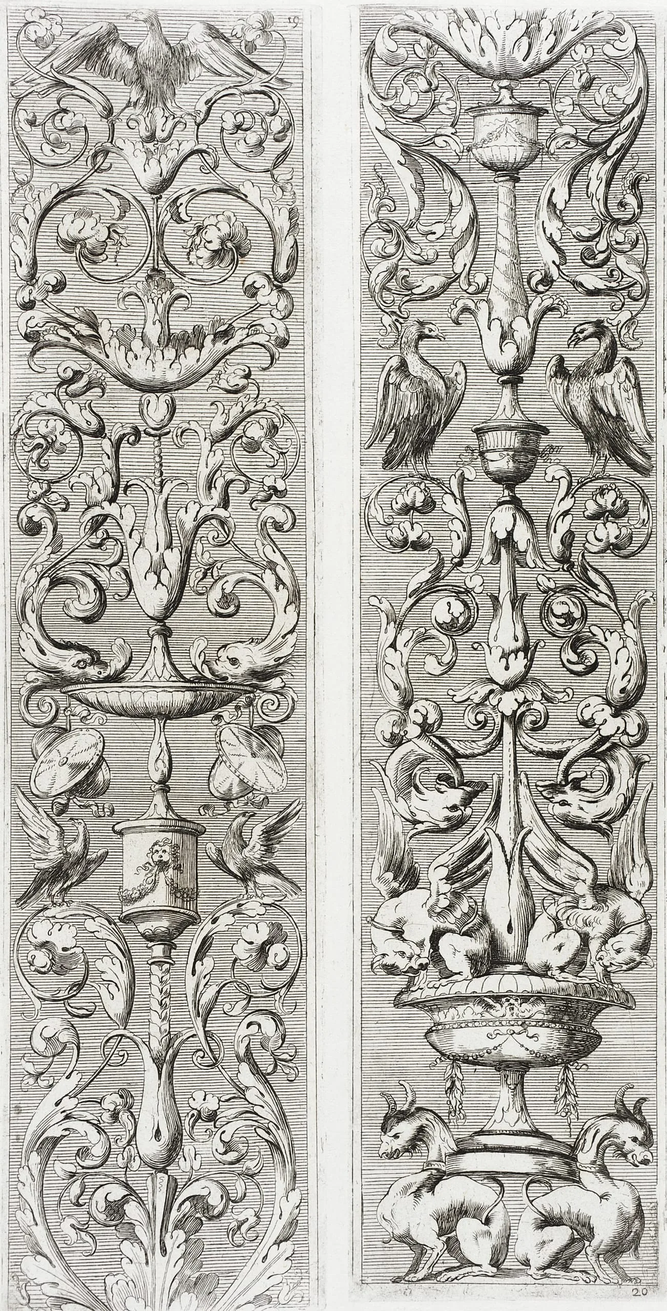 Engraving on cream paper, two vertical grotesque ornamental panels with acanthus scrolls, birds, griffins, urns, and animals along a central axis