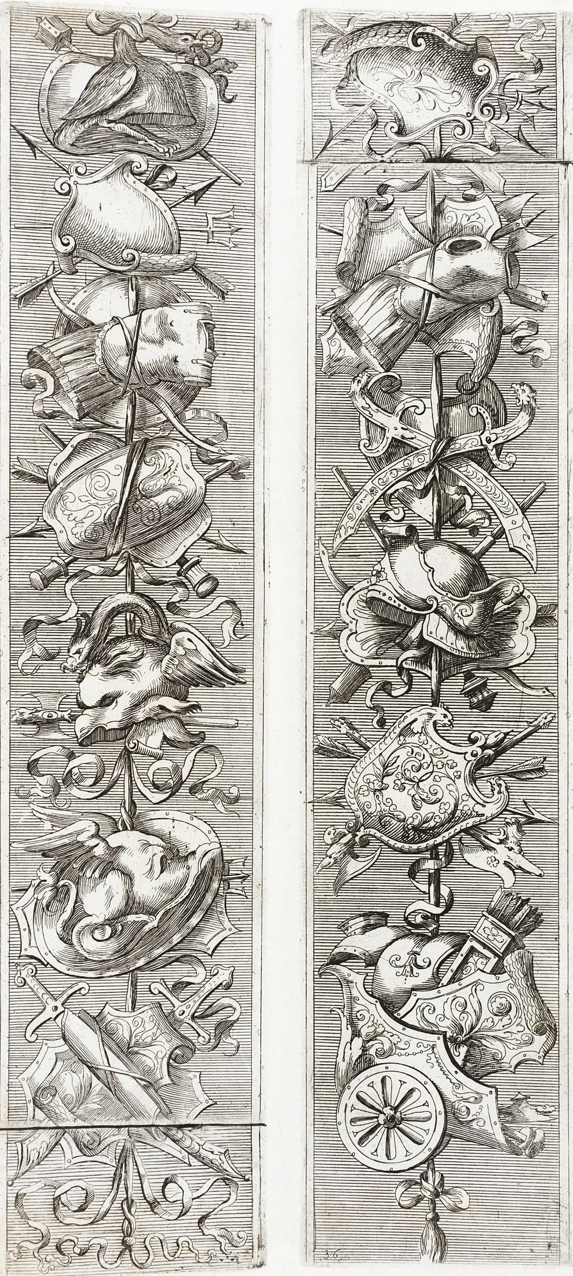 Engraving on cream paper, two vertical panels densely stacked with military trophies including helmets, shields, swords, animal heads, masks, and a cannon wheel, with fine hatched backgrounds