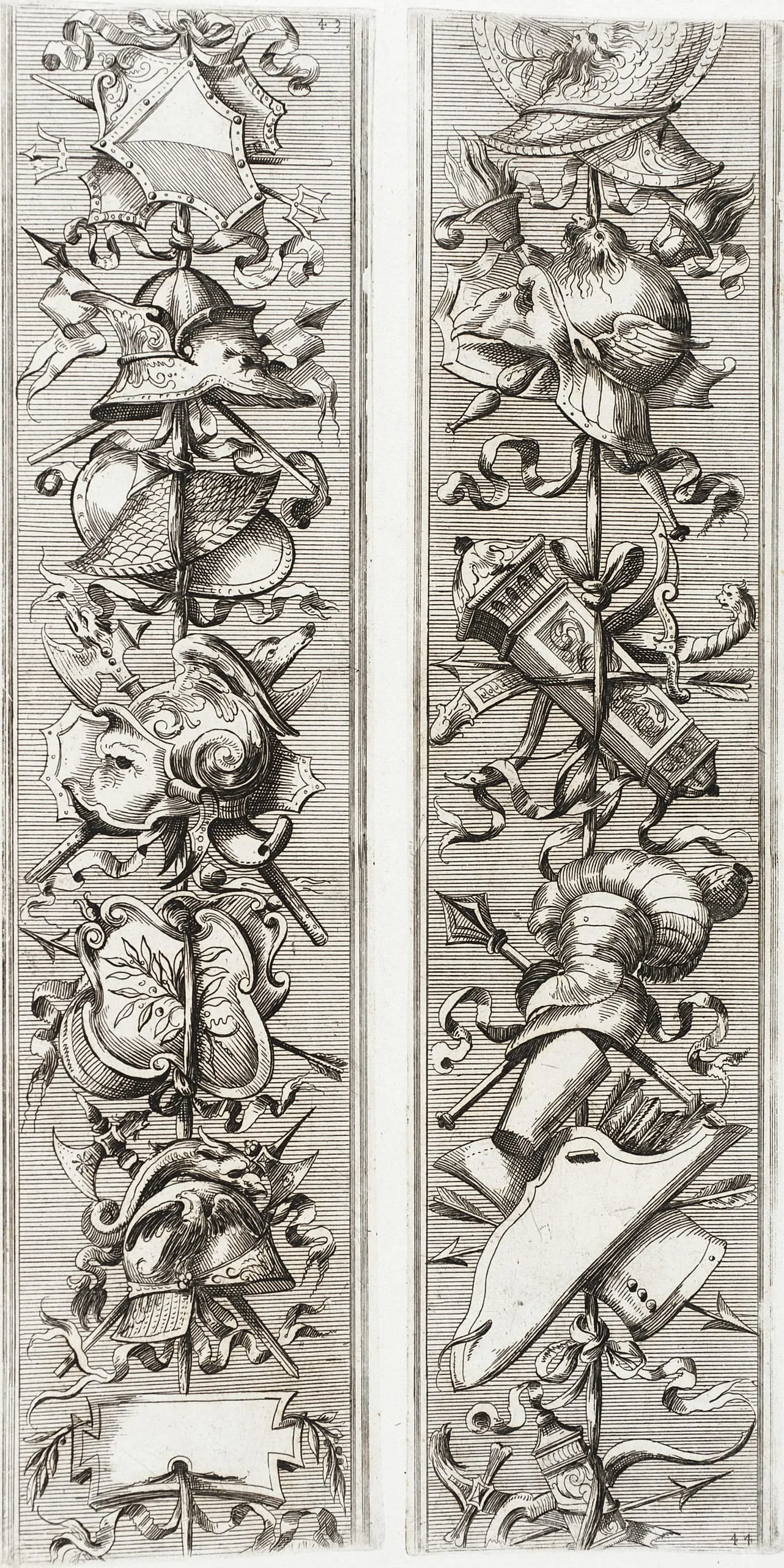 Engraving on cream paper, two tall narrow vertical panels densely filled with stacked military trophies, helmets, shields, scrollwork, and ribbons in fine parallel-hatched lines