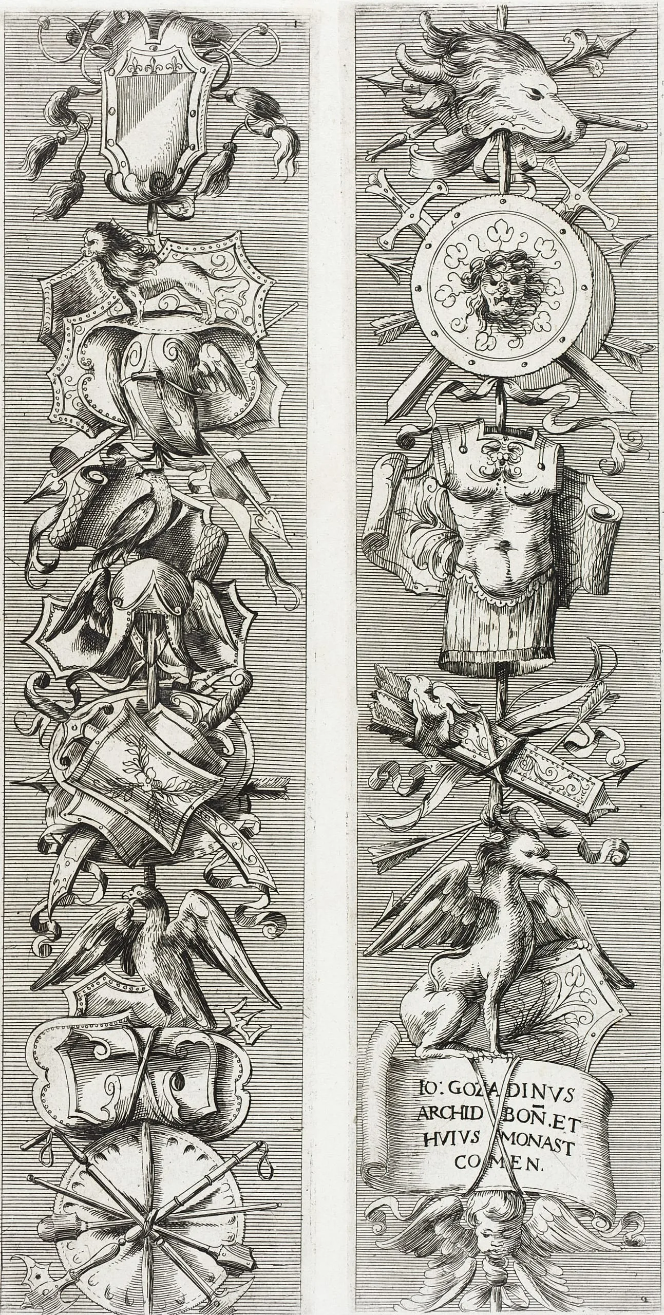 Engraving on cream paper, two vertical panels densely packed with stacked military trophies, heraldic shields, armor, weapons, birds, and mythological creatures in fine black lines