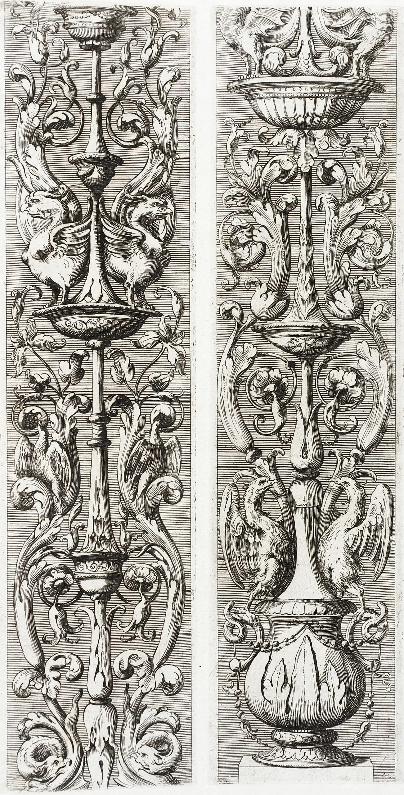 Engraving on cream paper showing two tall, narrow ornamental panels, each with a candelabrum-style column, winged creatures, acanthus scrolls, and stacked vases rendered in fine hatched lines