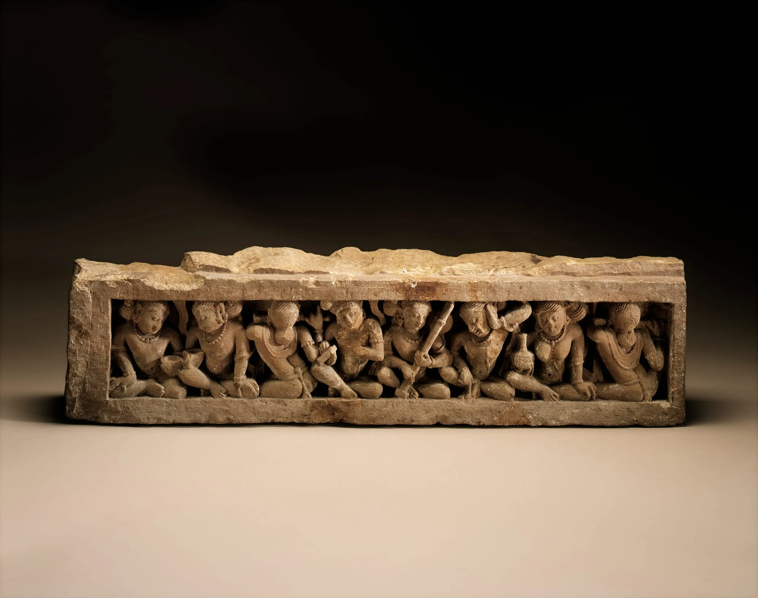 This lively frieze reputedly once adorned the Purana Mahadeva temple in Harshagiri, Sikar District, Rajasthan. As per the dedicatory site inscription, it was completed in 956 with structural embellishments and land endowments received up to 973. The temple was designed and constructed by the architect Chandrashiva for a Brahman patron named Allata during the reign of Maharajadhiraja Simharaja (r. circa 944–971) of the Chahamana Dynasty (948-1192). The magnificent temple is described in the inscription as,