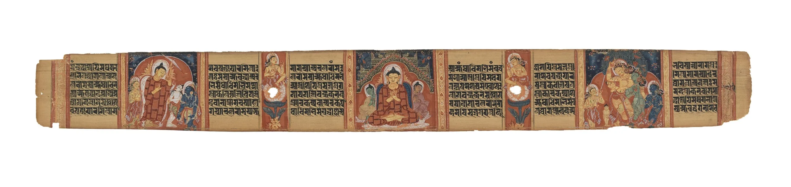 Manuscripts of the text were often illustrated with scenes of the eight important episodes from the life of the Buddha (traditionally dated to 563–483 BCE). Three such events are depicted here. The scene on the right is the birth of the Buddha in the Lumbini Park, Nepal. Queen Mayadevi, represented with yellow skin, stands under a flowering Sala tree (Shorea robusta) while the infant Buddha issues forth from her side with his hands joined in the gesture of adoration (anjali mudra). The child is shown again standing to her right, which likely symbolizes the seven steps he took immediately after his first bath to announce his spiritual sovereignty over the world. Mayadevi’s sister, the green-skinned Mahaprajapati, supports her sibling. To their right, Indra, the king of the gods, holds an honorific parasol over Mayadevi. An unidentified blue-skinned goddess completes the ensemble on the other side of Mahaprajapati. The central scene depicts the great miracle of Shravasti when the Buddha multiplied himself in front of a congregation of heretics to establish his superior magical abilities. The larger central Buddha has his hands held in the teaching gesture of Turning the Wheel of the Law (dharmachakra mudra). He is flanked by two smaller Buddhas wearing different colored robes. All three Buddhas sit on a lotus base underneath a tiered shrine. The scene on the left depicts the miracle of the Buddha’s descent from the Trayastrimsha Heaven at Sankisya, Uttar Pradesh. The Buddha stands in the center of a white nimbus and aureole (prabhavali) wearing his customary patchwork robe. Behind him, the yellow-skinned Indra with his thousand eyes holds an honorific parasol over the Buddha. In front of him, two Hindu gods stand: An ash-colored Shiva with a third eye and wearing a tiger skin around his waist and the four-armed, blue-skinned Vishnu holding his conch, lotus, and mace attributes with his fourth hand held in front of his chest in what may be the gesture of discourse (vitarka mudra). There are two scene dividers with yellow-skinned figures seated on lotuses.