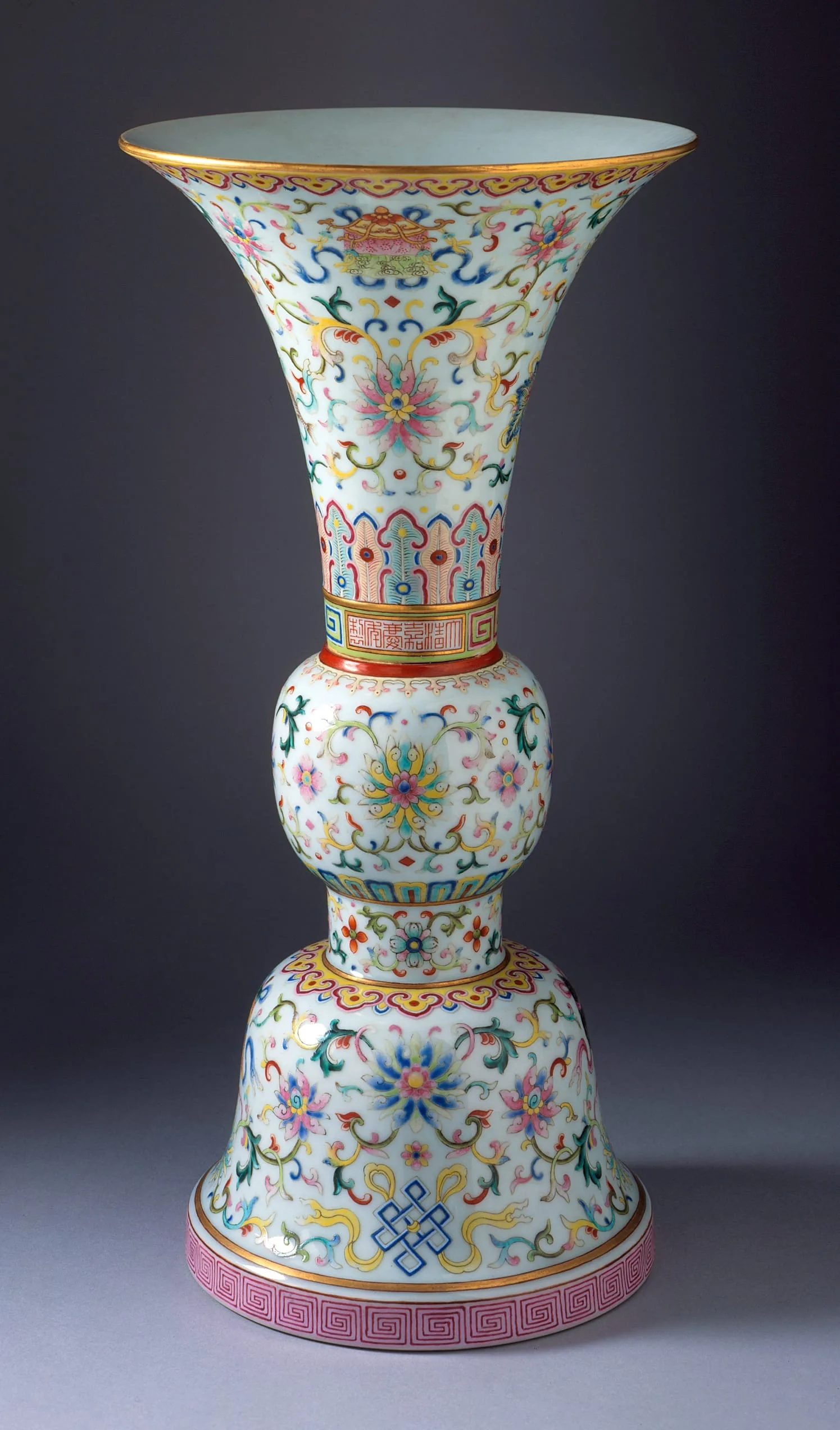 - Vase (Ping) in the Form of an Ancient Ritual Wine Cup (Gu) with the Eight Buddhist Symbols (Bajixiang) and Floral Scrolls