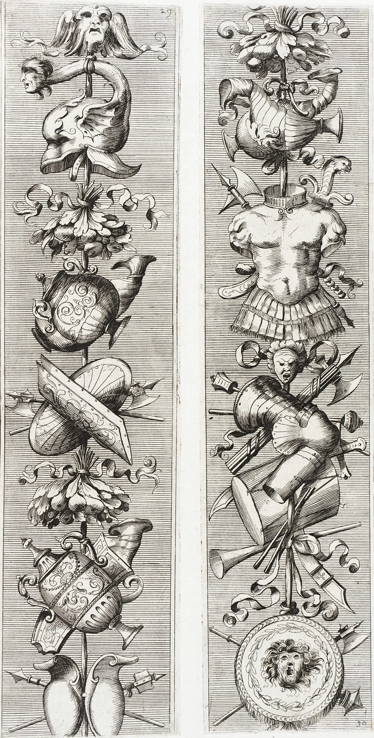 Engraving on cream paper showing two vertical decorative friezes stacked with military trophies, grotesque masks, armor, weapons, and fantastical figures in dense, precise hatched lines