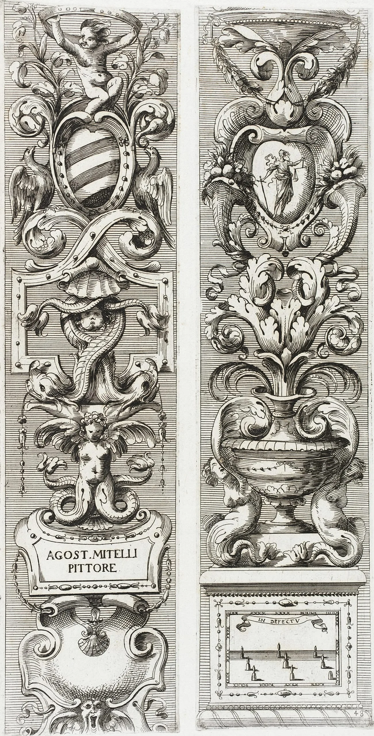 Engraving on cream paper showing two tall vertical ornamental panels densely filled with scrolling acanthus, grotesque figures, cartouches, putti, heraldic shields, and urns in the grotesque decorative style