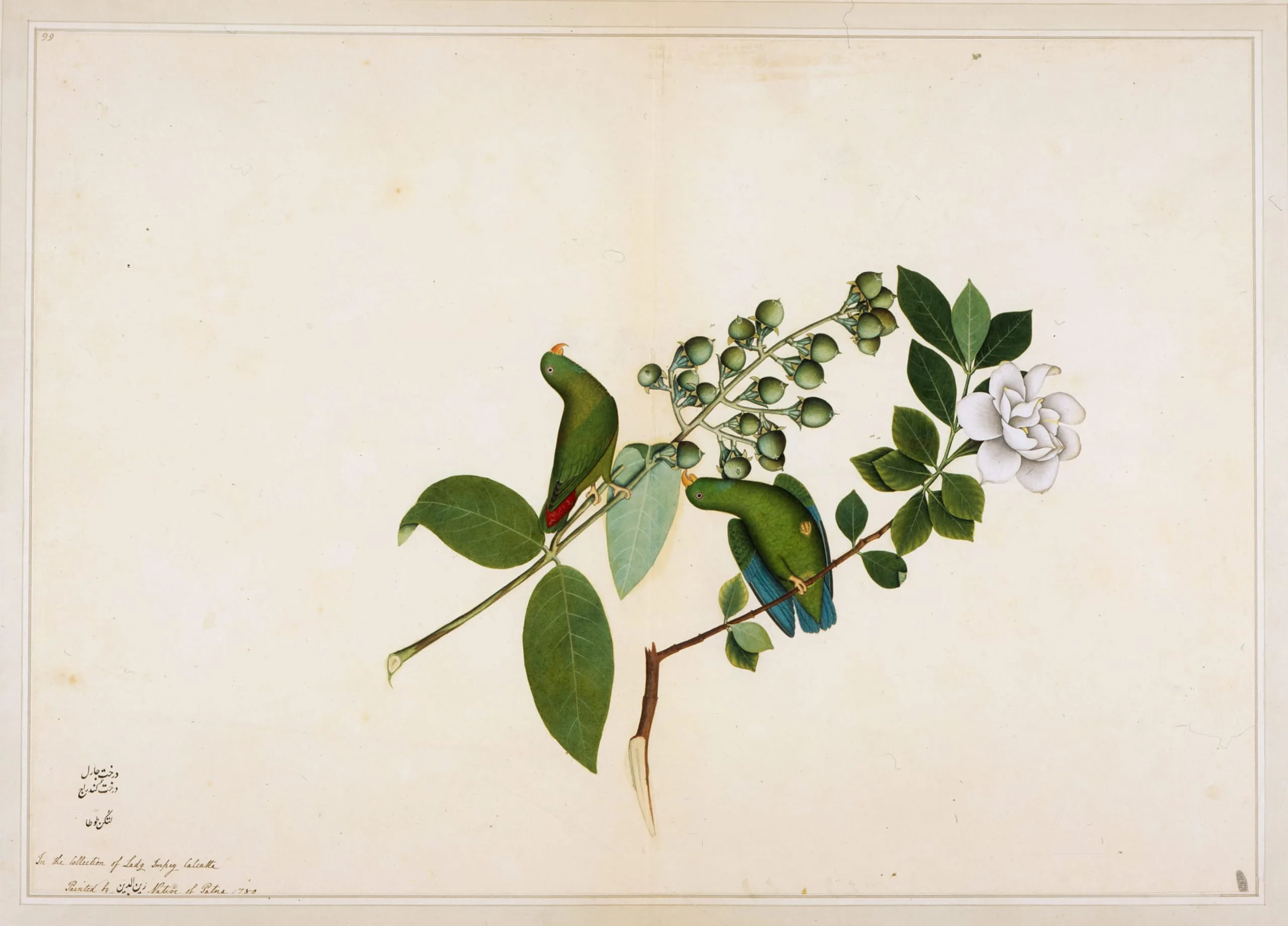 The Persian and English inscriptions identify the subjects and the artist, Shaikh Zaya al-Din (Zainuddin) of Patna in 1780 and state that it was in the collection of Lady Impey, Calcutta. Zaya al-Din (active 1777-1782) was the lead painter for the Impey Album, along with Bhawani Das and Ram Das. In the upper left corner are the numerals “99” indicating the folio’s sequence in the album. Painted on a large sheet of imported English Whatman paper (J WHATMAN watermark), the illustration depicts a pair of hanging parrots (latkan tota). The upper parrot is perched on a branch of what is likely a Karanja tree (Millettia pinnata), while the lower parrot sits on a branch of Queen’s crepe myrtle (Lagerstroemia reginae Roxb., modern Lagerstroemia speciosa). (Translation by Wheeler Thackston.)