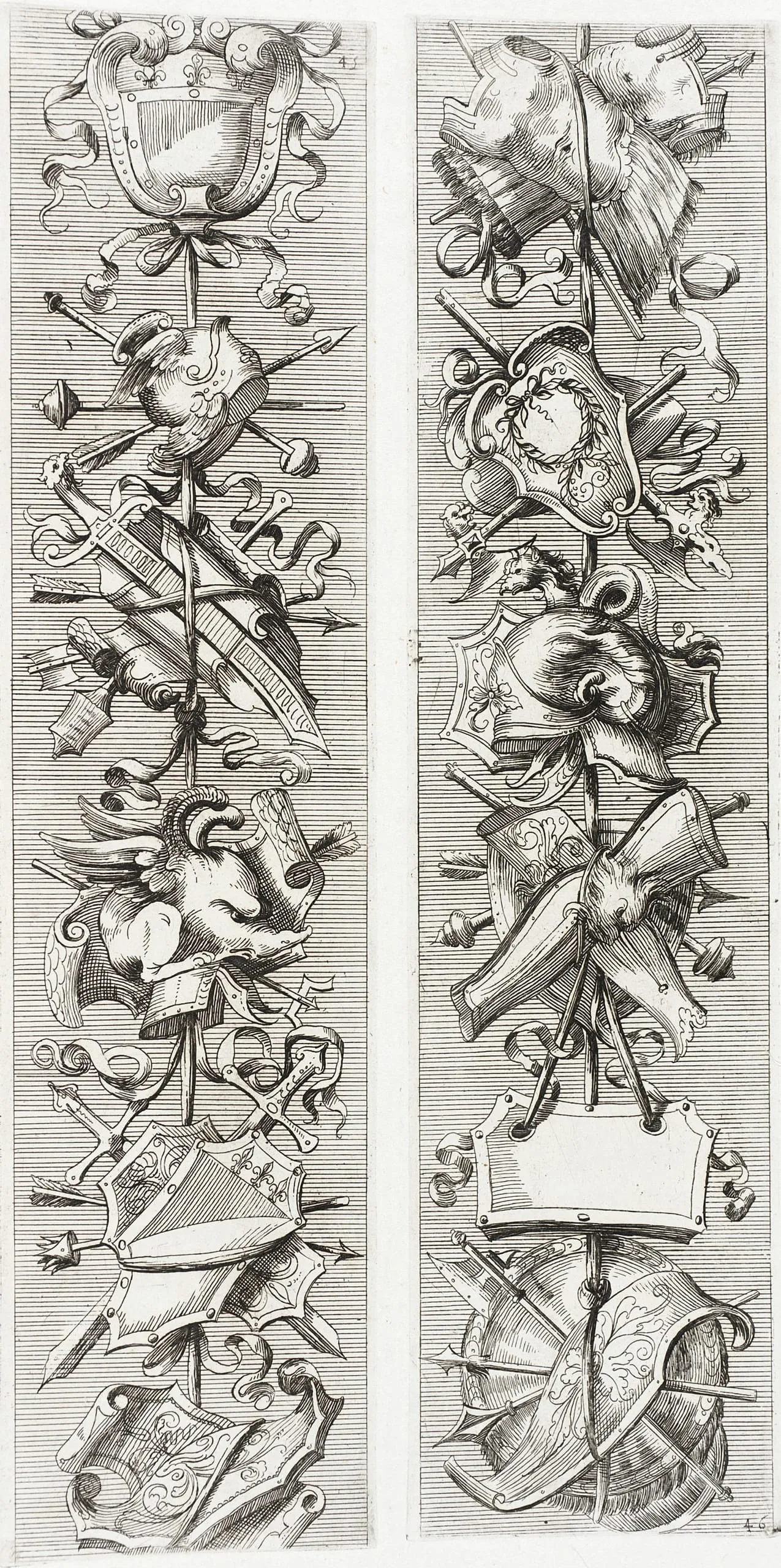 Engraving on cream paper showing two tall vertical panels densely stacked with heraldic shields, helmets, crossed weapons, skulls, and trophy garlands in fine black lines