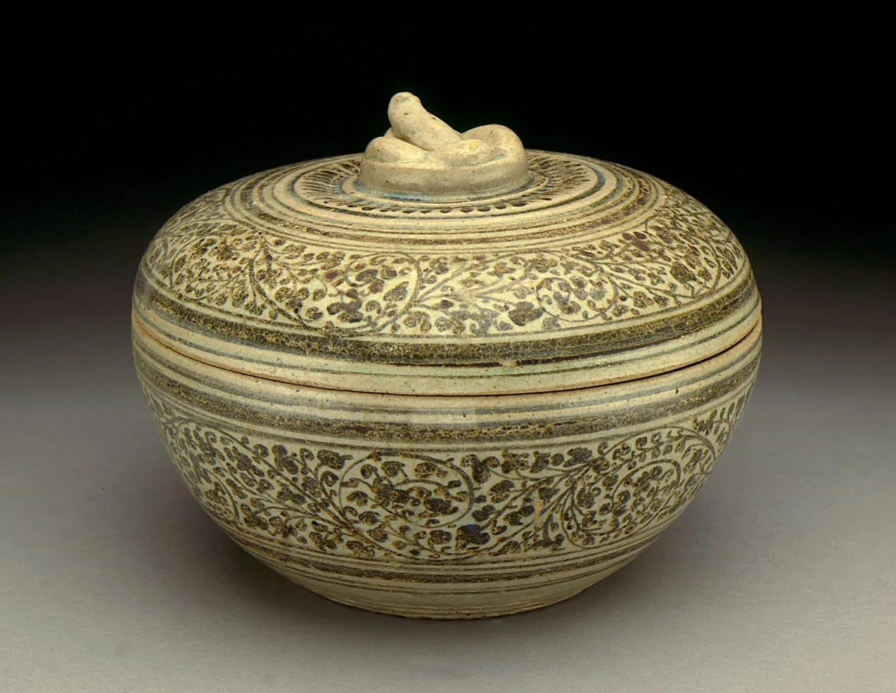 This unusually large, fruit-shaped covered bowl is a characteristic Thai form. The bowl is decorated with iron-black scrolls over gray slip. Its clear glaze, tinged blue where it pools, is typical of Sawankhalok ware.