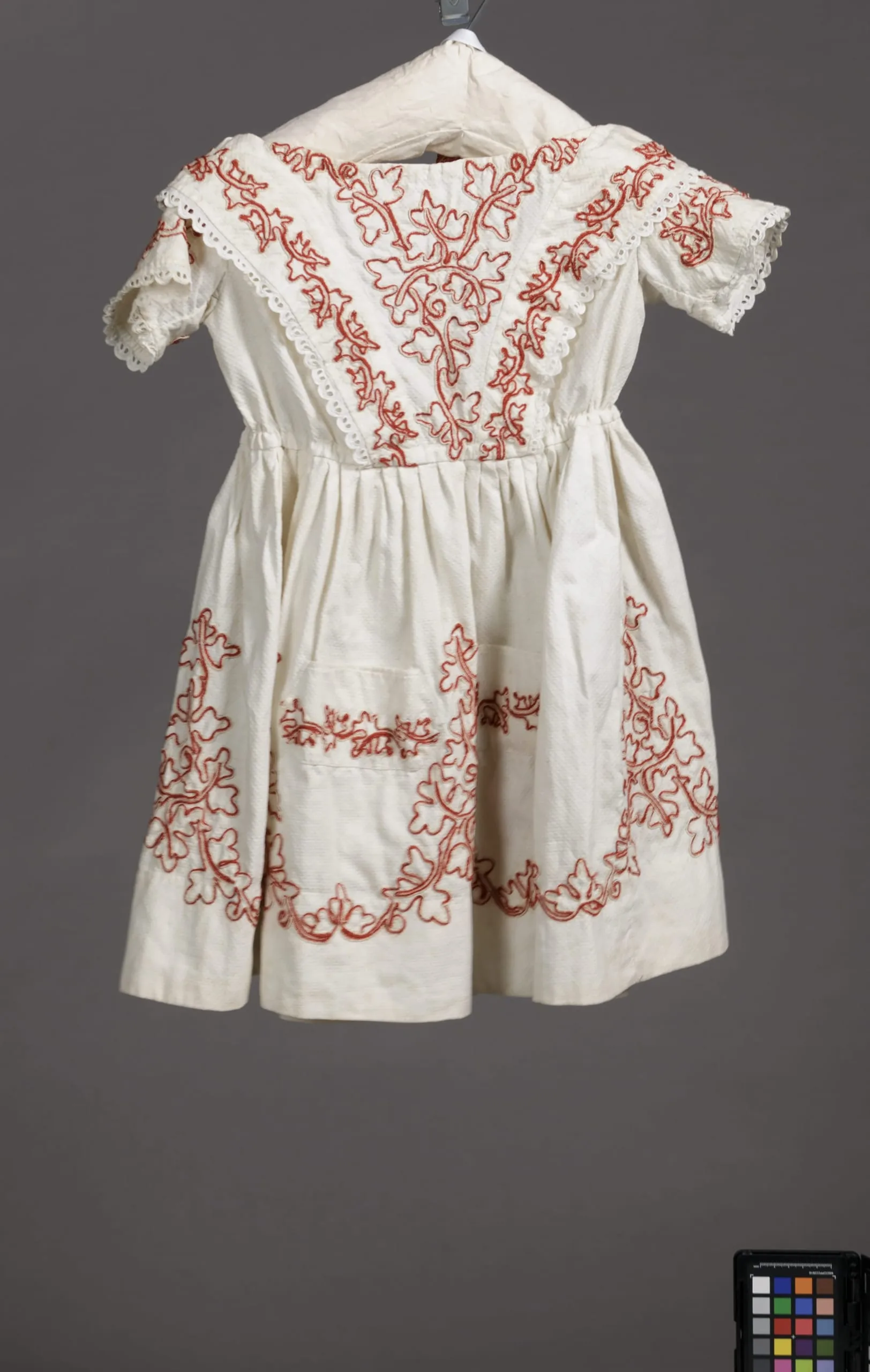 - Dress: Cotton plain weave (piqué) with cotton embroidery and wool braid (soutache)