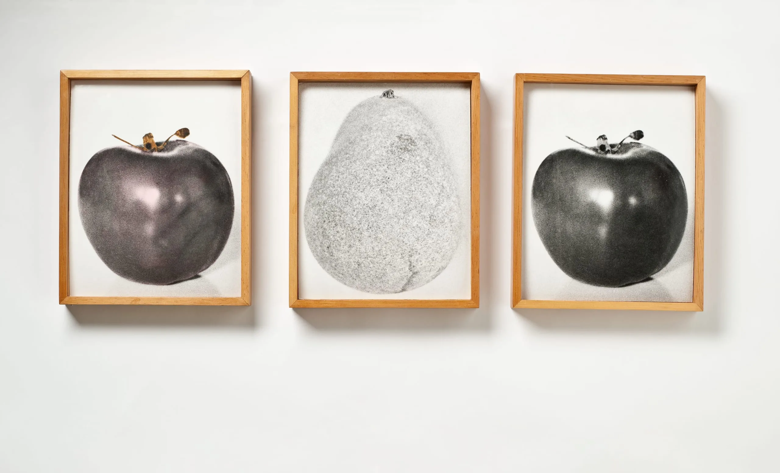 - A) Apple (tinted pink): 13 x 10 3/8 in. b) Pear: 13 x 10 5/16 in. c) Apple (black and white): 13 x 10 3/8 in.