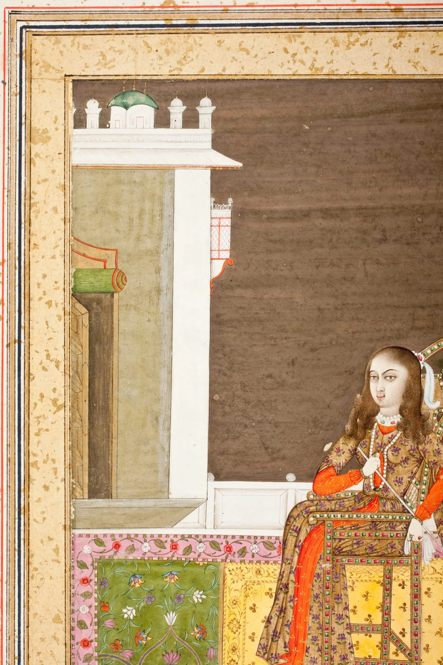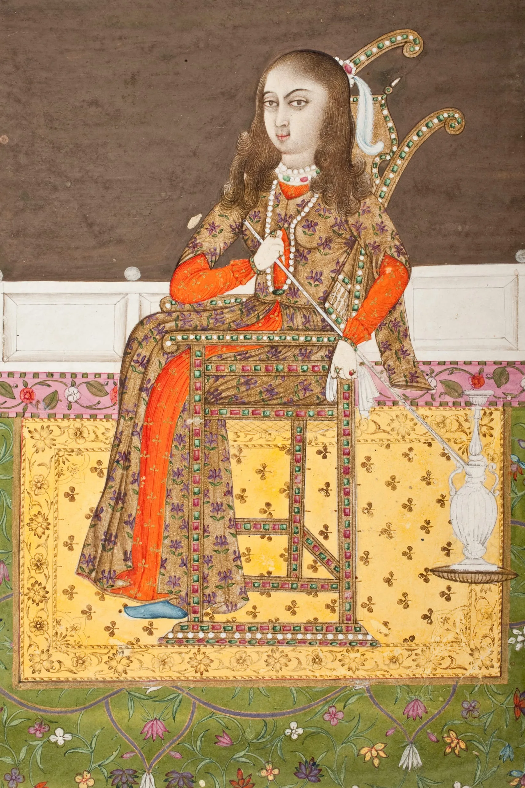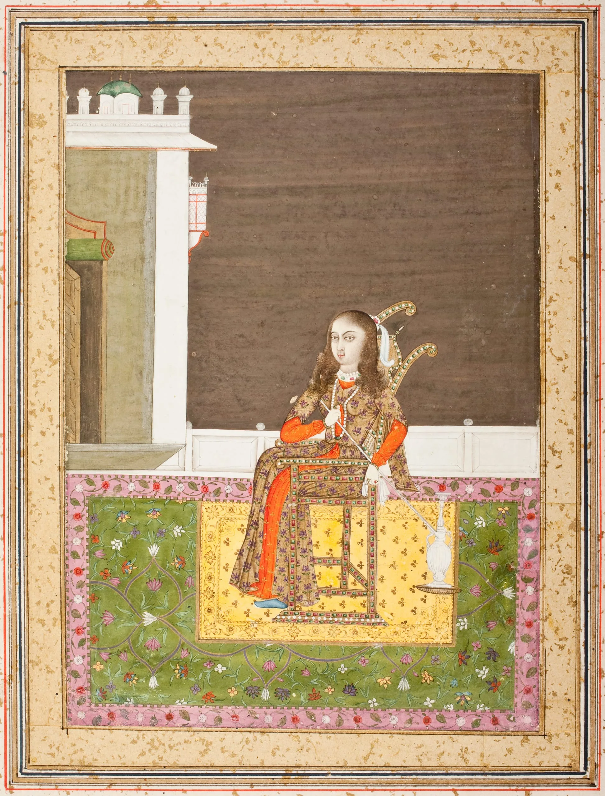 The eclectic style of Mir Kalan Khan (active circa 1730-1780) encouraged many followers, including the artist of this painting, which combines features drawn from European and Indian sources. The European woman is dressed in a long outer garment adorned with purple irises on a gold ground. It is worn over an orange inner garment with gold flowers. Note the outer garment’s sleeve hanging from the left arm. She wears a long strand of pearls interspersed with rubies and emeralds. Her long hair cascades onto her shoulders with a feather plume dangling from hey bejeweled hair ornament on the back of her head. She sits in a European-style chair with a tall back, arched crest rail, voluted finials, and inset gemstones. In her right hand, she grasps a stiff reed used as an inhalation tube for smoking a Venetian-style hookah, the base of which appears to be made of either opaque “milk” white glass or porcelain. She holds a handkerchief in her left hand. The setting is a palace terrace at night. She is seated on a small yellow-and-gold rug, which is unusually laid atop a larger green-and-pink floral carpet covering the entire terrace.