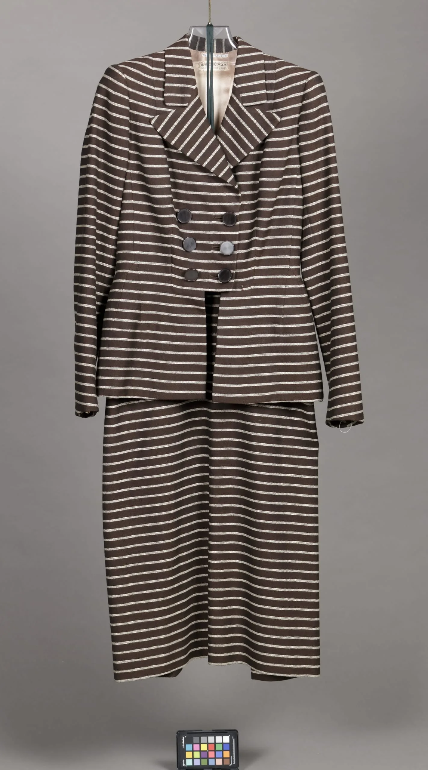- Jacket: wool twill with wood buttons; Skirt: wool twill