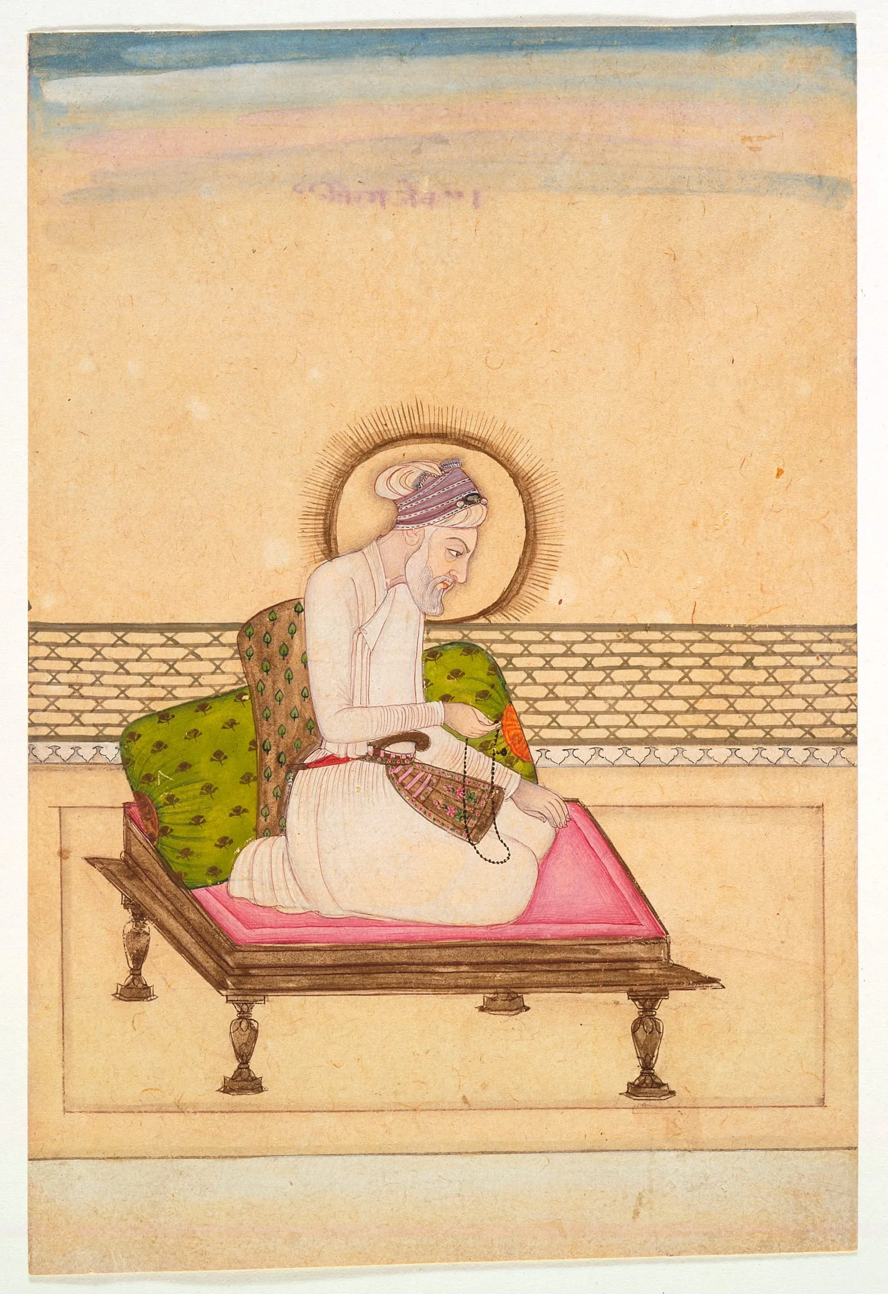 Images of the emperor from his final years and posthumous portraits typically portray him in what came to be trope as a pious Muslim counting his prayer beads, such as in this posthumous portrait, or reading the Qur’an (such as in a similar portrait attributed to circa 1700 in the British Library, London [Johnson Album 2, 2]).