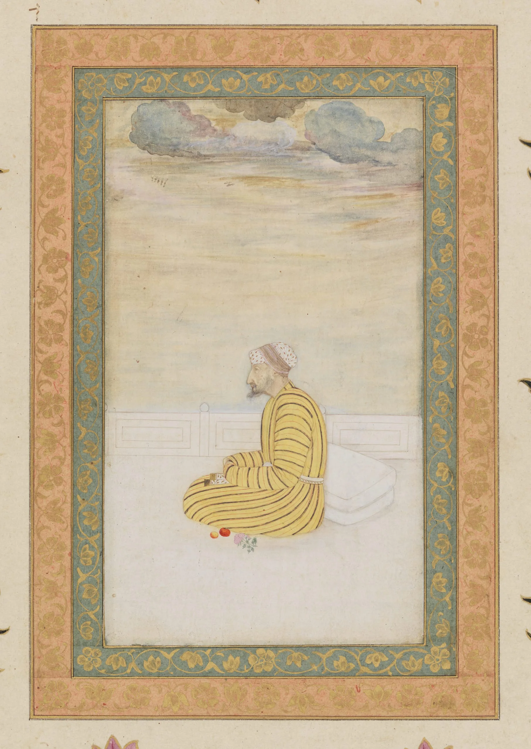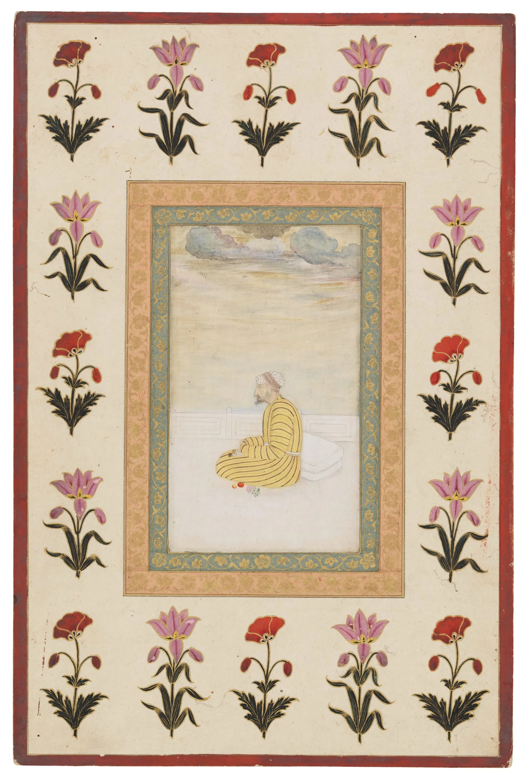This folio is from the Small Clive Album, the majority of which is preserved in Victoria and Albert Museum, London (IS.48-1956). The album was assembled and thought to have been given by the Lucknow Nawab Shuja al-Daula (r. 1754-1775) to Lord Robert Clive (1725-1774) during his final visit to India in 1765-1767. It included earlier paintings, including now-dispersed folios such as this sensitive portrait of a contemplative man seated on a terrace, perhaps a religious personage, a mystic, or a Sufi. The distinctive border of red poppies and pink lilies is found on numerous folios in the Small Clive Album.