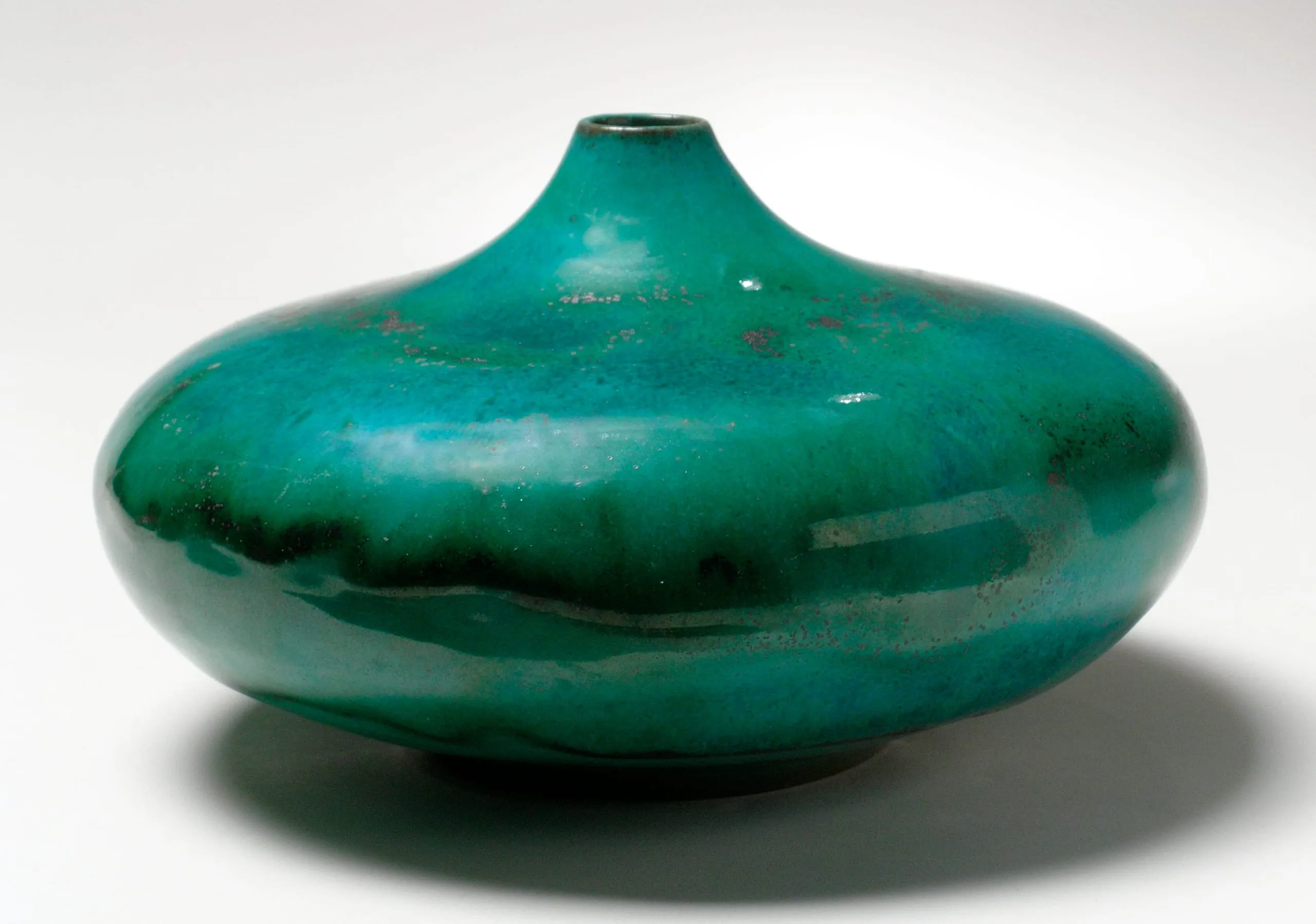 Ceramic vessel with a squat, flattened spherical body and tiny narrow neck, covered in a glossy teal-green glaze with darker pooling and scattered red flecks