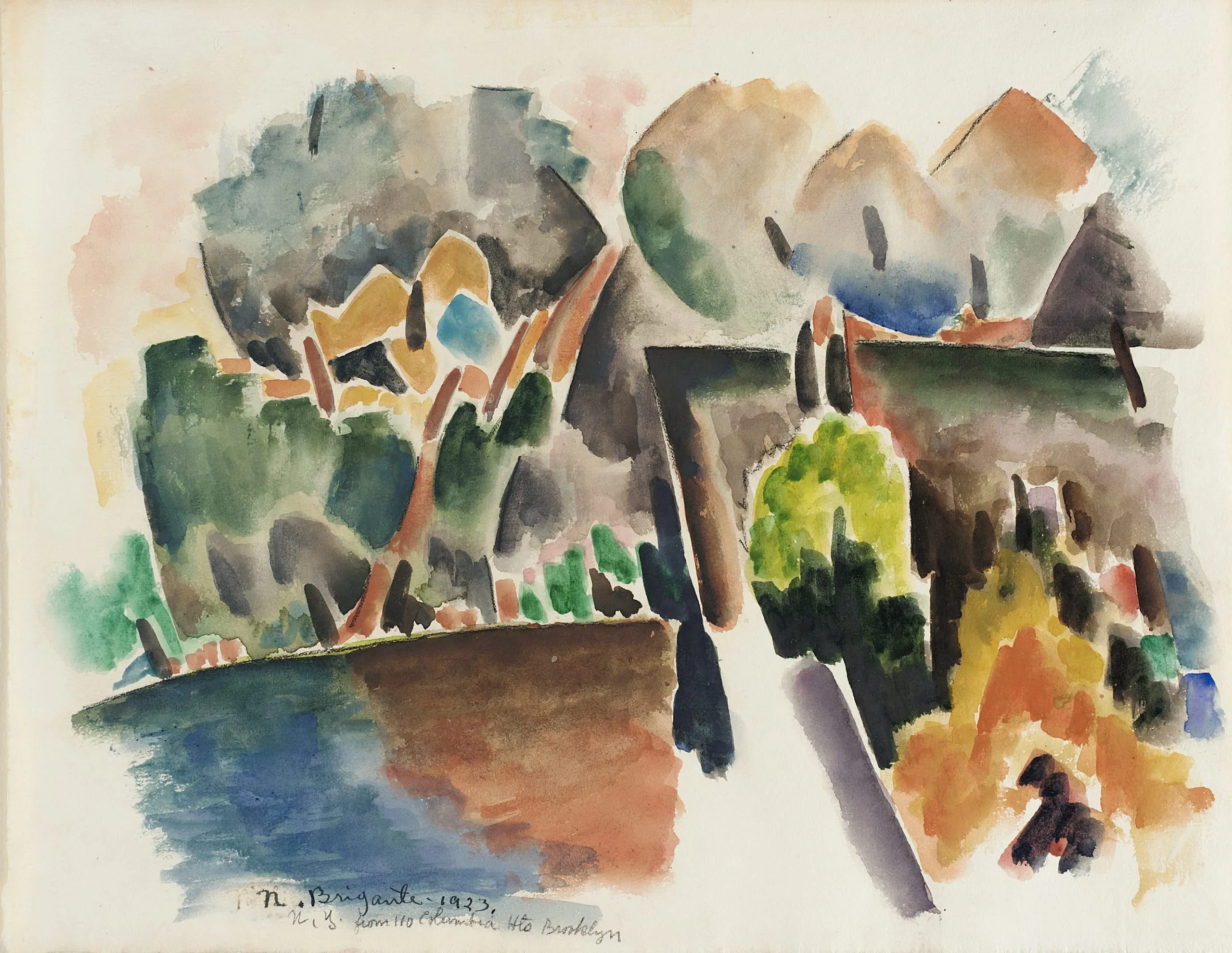 In April 1923 Brigante left Los Angeles for New York. The year he spent there was of seminal importance to his artistic development. He lived in a house on Columbia Heights in Brooklyn rented to him by the modernist sculptor Robert Laurent (1890-1970). Brigante, anxious to learn all he could, visited Alfred Stieglitz (1864-1946) in his gallery and became better acquainted with modern American trends, and he began exhibiting at the progressive Daniel Gallery. A devoted watercolorist, Brigante admired the art of JOHN MARIN and Charles Sheeler (1883-1965) but was most influenced by the work of CHARLES DEMUTH.
