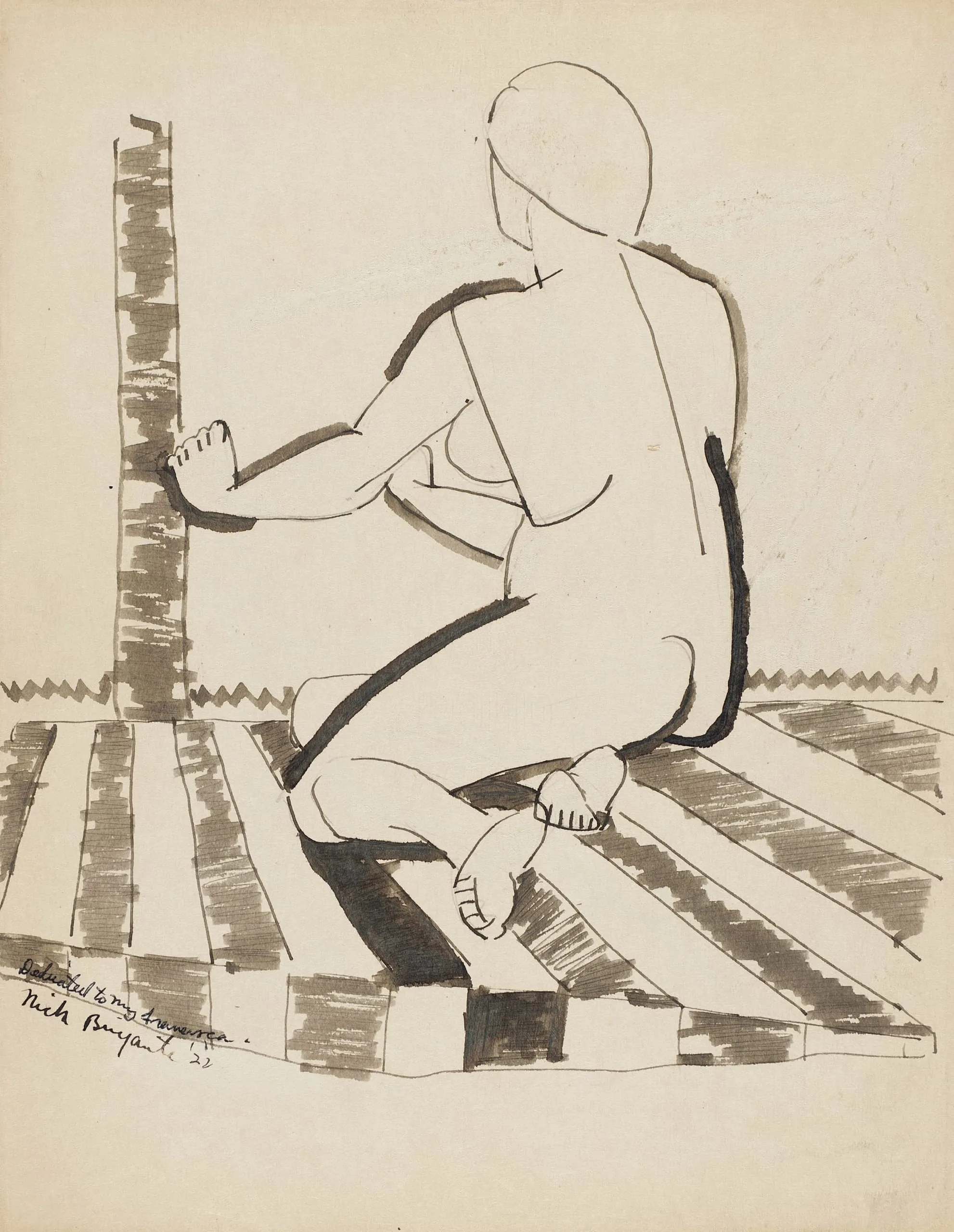 Nude Woman Seated on Stripes (Rear View)