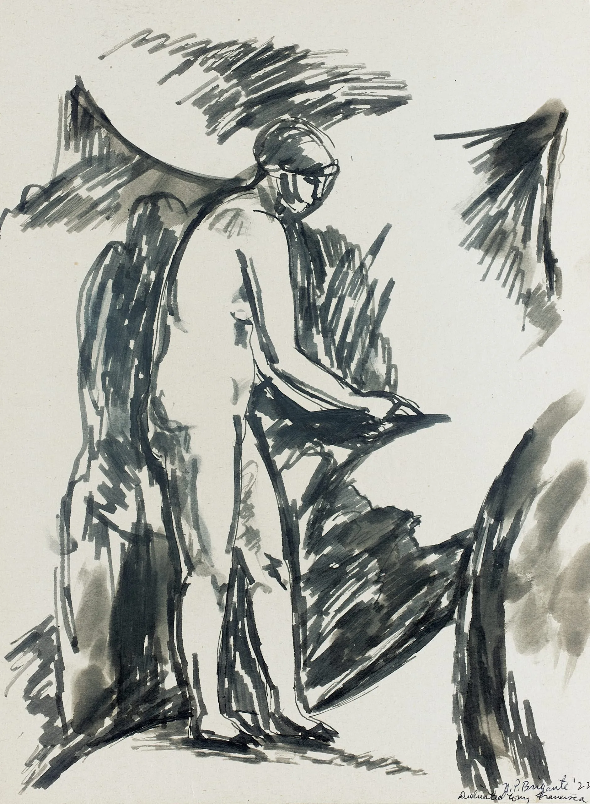 Ink and wash drawing of a standing nude figure surrounded by bold diagonal hatching strokes, on off-white paper, with a handwritten inscription in the lower right
