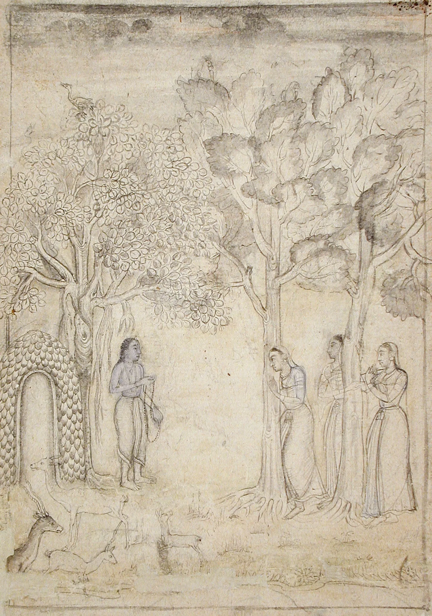 This nim qalam (half-pen) lightly tinted drawing depicts the youthful ascetic Rishyashringa at his hermitage. As narrated in the great Indian epics, the Ramayana (Adventures of Rama) and the Mahabharata ([War of the] Great Bharatas), Rishyashringa (having deer antlers) was supernaturally born of a doe and had a small protuberance on his forehead, whence his name. He led a sheltered life in a forest hermitage. One day he was approached by beautiful women sent by King Lomapada in the nearby kingdom of Anga who wished to request his aid in ending a severe drought. Enchanted by their beauty, Rishyashringa accompanied them to Anga, where his presence brought the lifegiving rains to end the drought. Here, Rishyashringa stands outside of his hut watching the women stealthily approach. He holds a long rosary, and his skin is ashen-colored in accordance with the ascetic’s practice of smearing one’s body with cremation ashes.