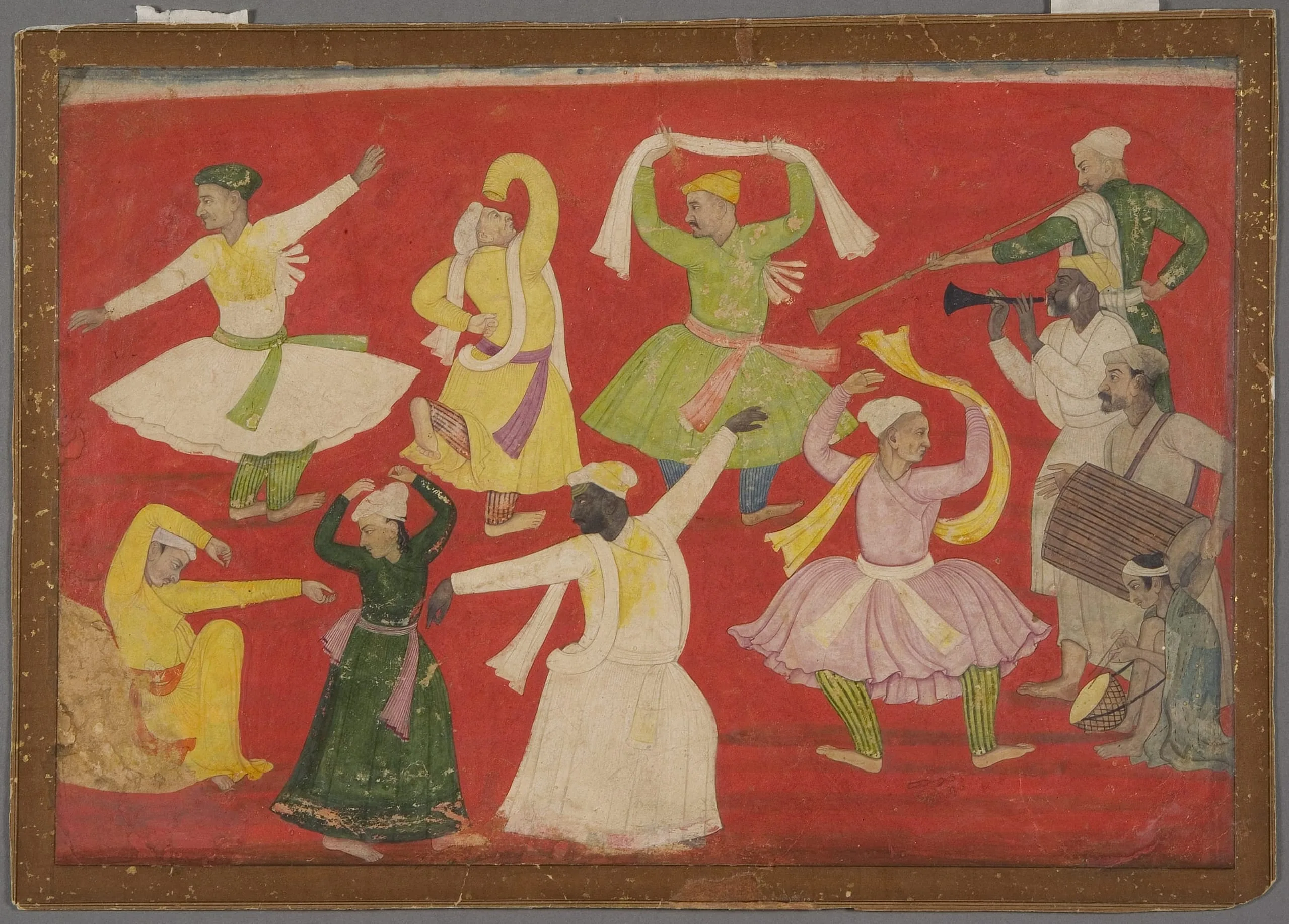A masterpiece in the Heeramaneck collection is this painting depicting seven men dancing with abandon to the tune of four musicians. It is remarkable for its unusual subject matter as well as its refined execution, lively portrayal of human form, and sensitive attention to portrait features. The painting is probably by Pandit Seu, an artist from Guler who is credited with introducing a more naturalistic approach to painting in the hill states. His highly individualized figures are accentuated by a monochromatic background typical of indigenous painting traditions throughout northern India. A traditional interest in rhythmic forms and lines is evident in the varied postures and flowing garments of his dancers.