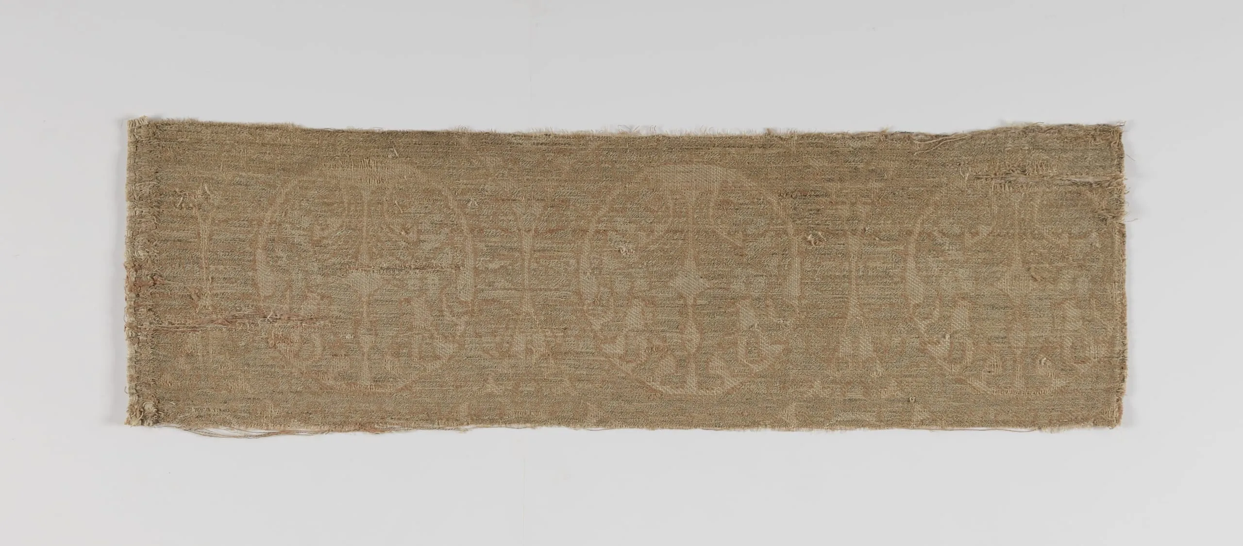 Horizontal woven textile fragment in muted khaki-tan, with three large circular medallions containing scrolling motifs in a self-patterned weave