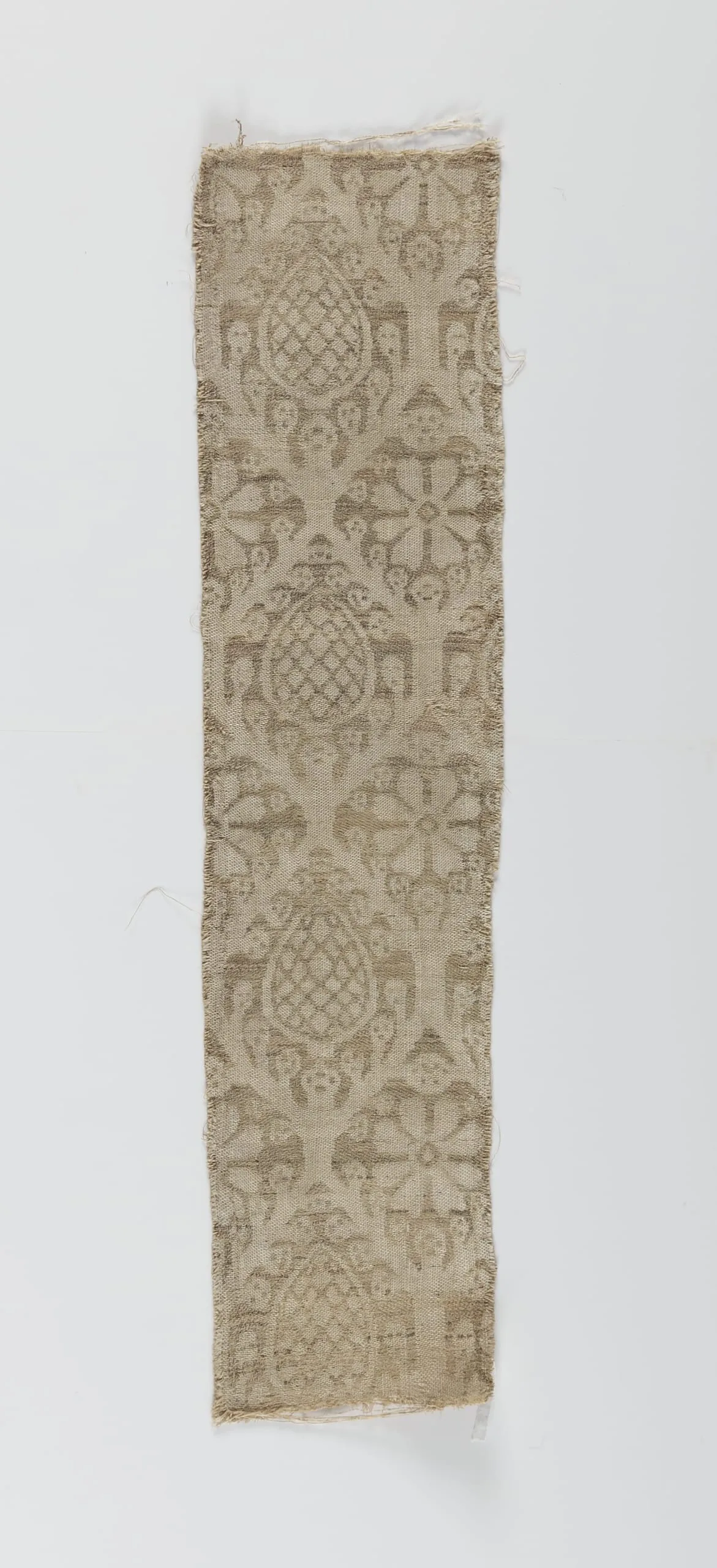 Narrow vertical textile fragment with tone-on-tone woven pattern of repeating pinecone motifs, scrolling animal forms, and rosettes in ivory and taupe