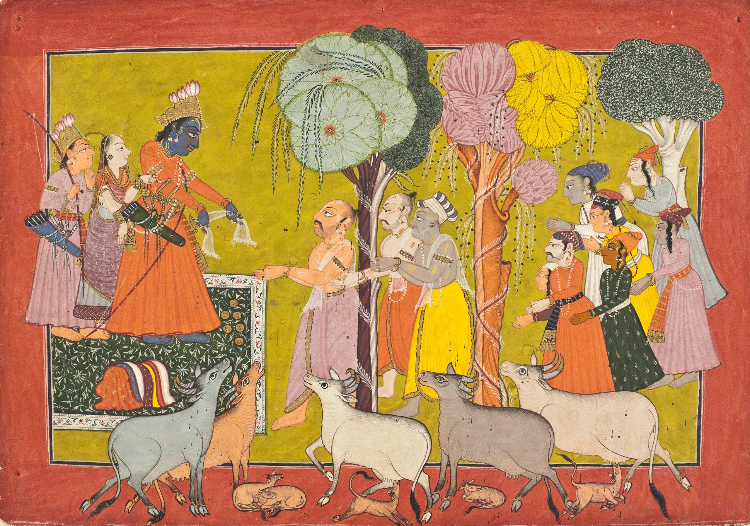This masterful painting depicts the well-known episode in Book 2 (Ayodhya kanda) of the Hindu epic, the Ramayana (Adventures of Rama), when Prince Rama gives away his possessions before being unjustly banished to his fourteen-year forest exile. He is accompanied by his wife Sita and his brother Lakshmana.
