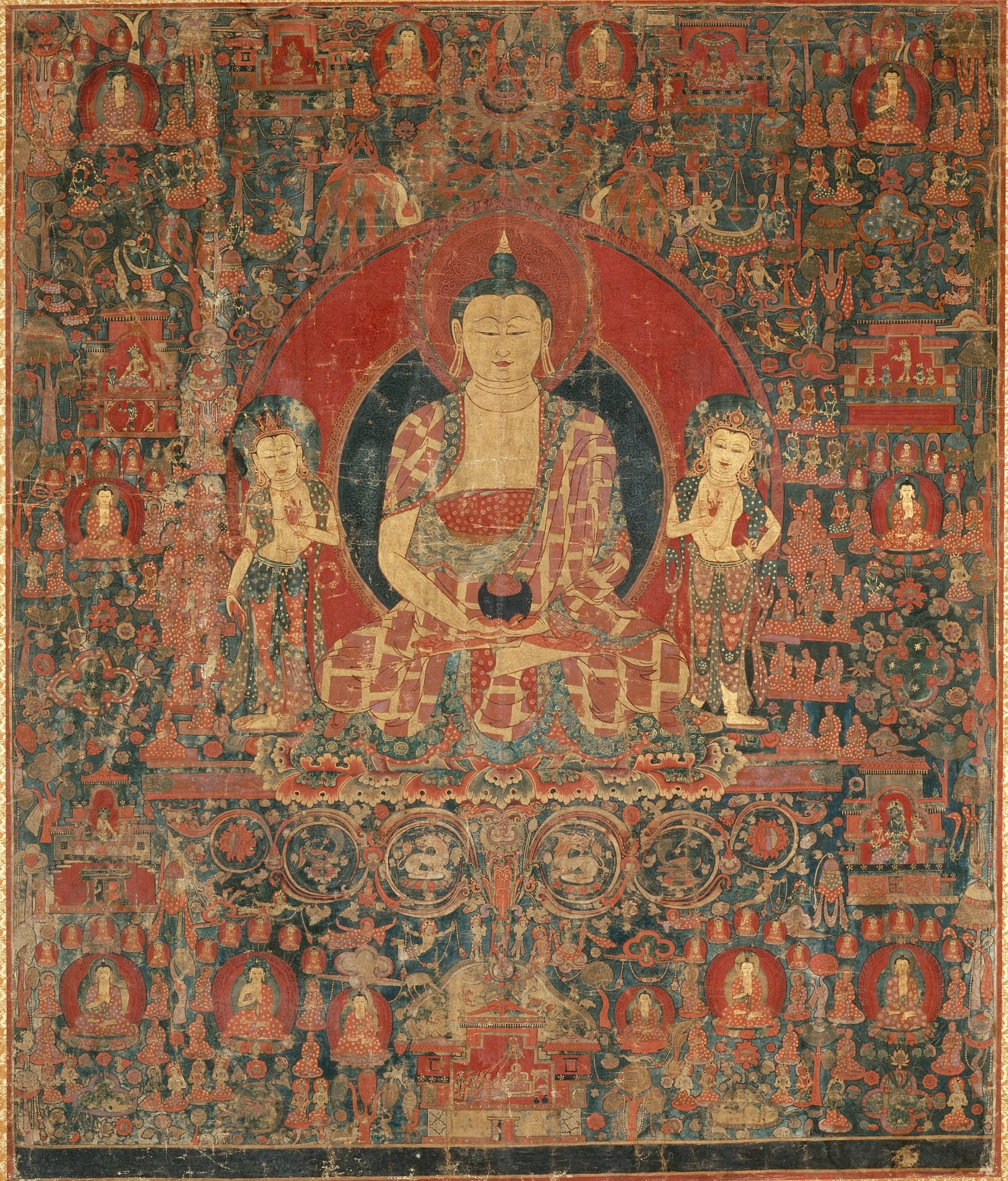 In the center of this painting, Amitabha, the transcendental Jina Buddha of Infinite Light, sits in the meditation posture (padma asana) on a lotus throne growing out of the cosmic ocean. He has elongated earlobes symbolic of his renunciation of the material world and the cranial protuberance (ushnisha) emblematic of his omniscience, which is surmounted by a golden finial. He wears a patchwork monk’s robe with decorative borders over both shoulders. His hands are placed in his lap in the gesture of meditation (dhyana mudra) and hold a mendicant’s begging bowl. He is flanked on his companion bodhisattvas standing within his red aureole (prabhavali). On his right is Avalokiteshvara (the Lord who gazes down [with compassion]), who holds his right hand in the gesture of charity (varada mudra) and his left hand in the gesture of discourse (vitarka mudra). On his left is Mahasthamaprapta (arrival of the great strength), who holds a thunderbolt (vajra) in his right hand and a ritual bell (ghanta) in his left hand resting on his waist. Surrounding the triad is a rich tableau representing the Pure Land Paradise (Sukhavati) with various monks and bodhisattvas listening to the divine discourse, elegant pavilions, and trees bedecked with jewels and garlands.