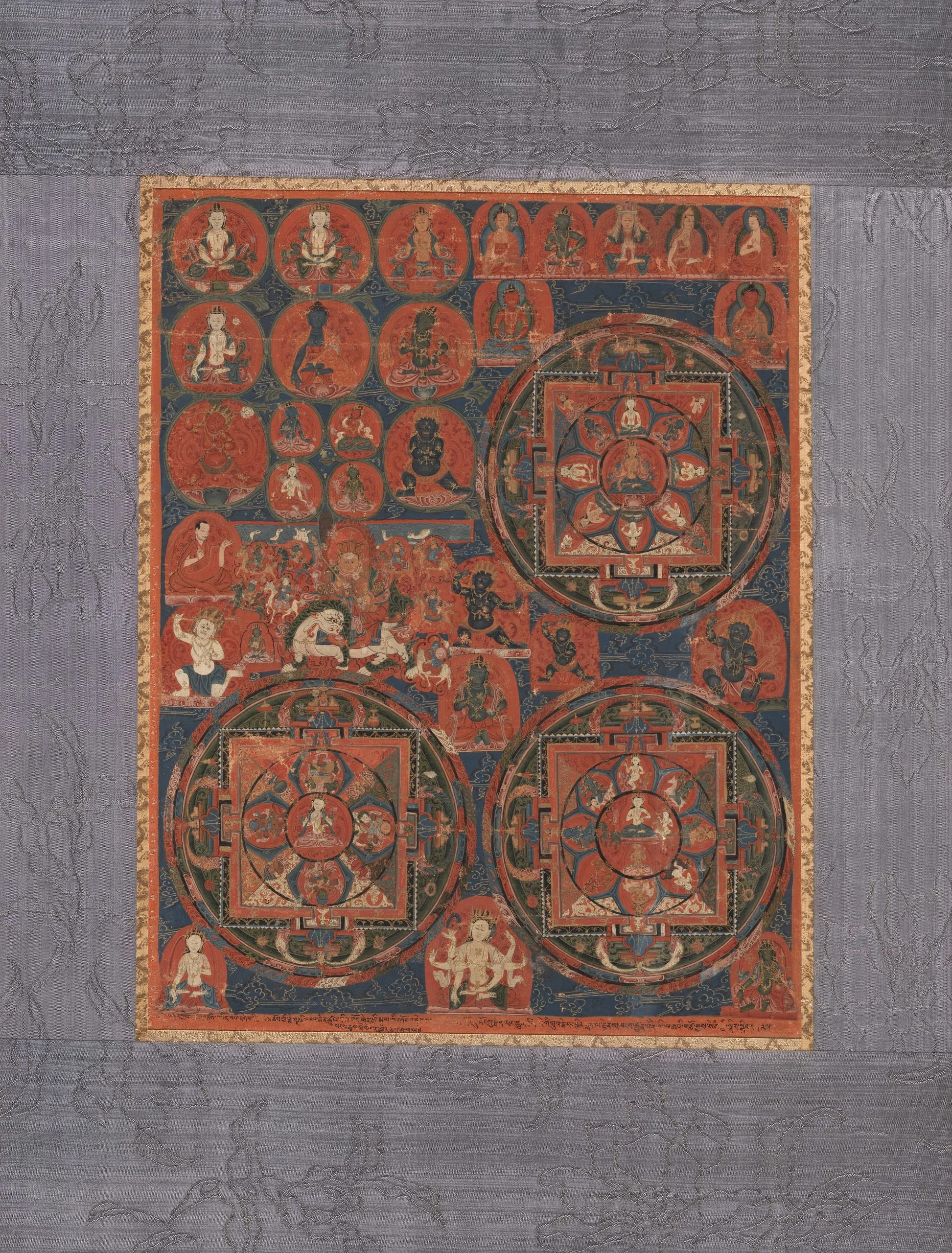 This atypical Tibetan thangka painting has an asymmetrical composition featuring three mandalas and numerous red aureoles or roundels connected by a scrolling vine. They contain various Buddhas, bodhisattvas, Buddhist protective deities (dharmapala), meditational deities (yidam), and monks belonging to diverse liturgical cycles. The upper mandala is devoted to Amitayus, the Buddha of Eternal Life (see also M.77.19.14, M.83.253, and M.84.32.5). Both lower mandalas are centered on the primordial teacher Vajrasattva (Adamantine Being). In the center-left section of the painting, Vaishravana, the Buddhist god of wealth, directional guardian of the North (dikpala), and dharmapala, rides his snow-lion mount. He carries his banner standard (dhvaja) and wears a padded textile armor overcoat and a red fan-shaped hat topped by a gold finial. He is accompanied by his troupe of eight Generals, the Lords of the Horses (ashvapati), each wearing Mongolian garb and riding within a storm cloud. The group appears to be moving toward, or perhaps conjured up, by a seated monk wearing red robes and holding his hands in explication gestures. Pratapaditya Pal has suggested that the monk may represent the Lama Tshulgyi Özer mentioned in the Tibetan inscription in the lower border. (Pal 1990, 323) The inscription reads, This mandala, one of a series [of twelve], was dedicated by Gyaltsen Özer for the cleansing of his sins, those of his father and mother, and all creatures. It prays that the learned Lama Tshulgyi Özer may attain fulfillment of his wishes. (Translation by H. E. Richardson.)
