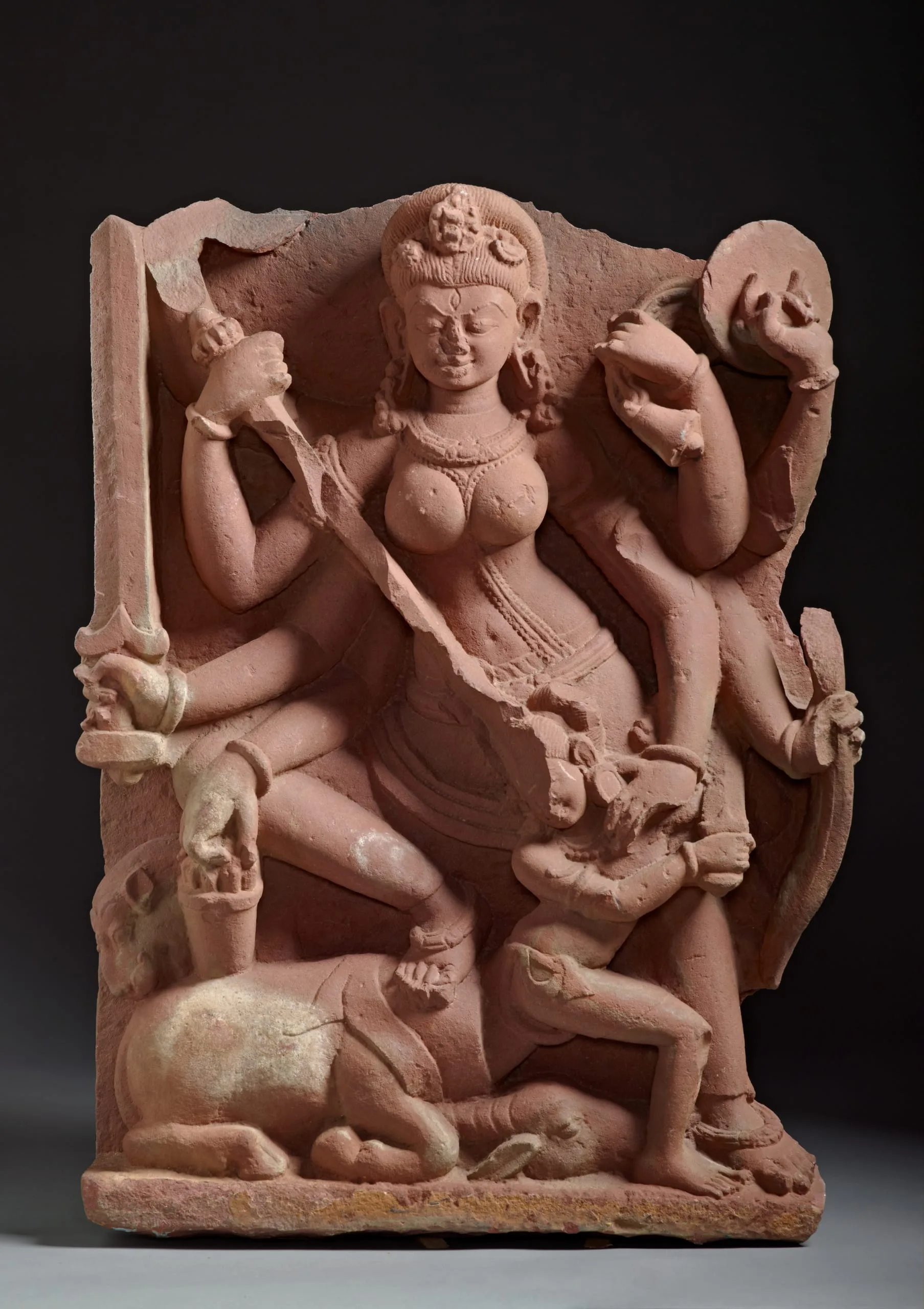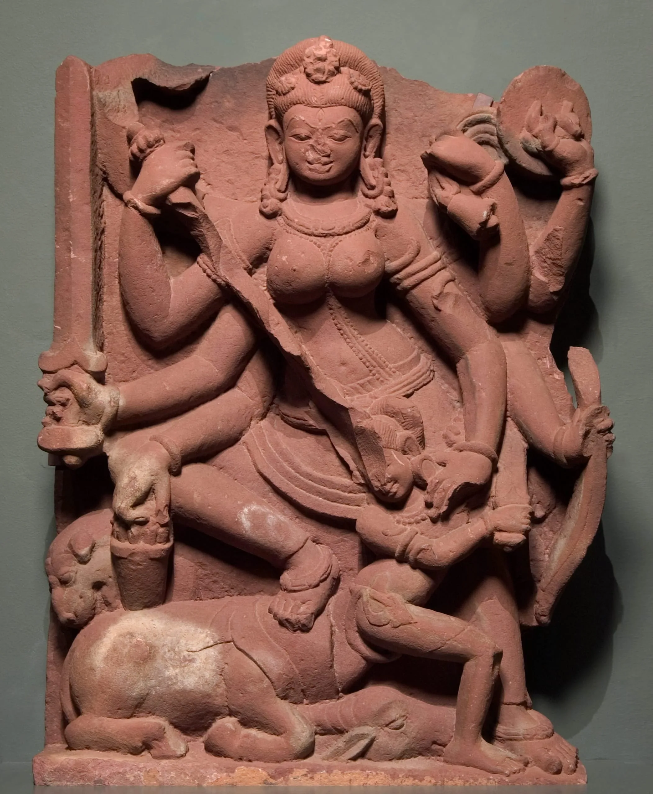 The Hindu goddess Durga (Unconquerable) is the terrific aspect of Shiva’s spouse, Uma. She is the invincible goddess of the battlefield and plays a vital role in the eternal struggle between order and chaos. Durga is one of the most widely worship deities of Hinduism, being especially invoked by the warrior classes. Although she can assume many guises, the most popular and the form most encountered in art, is that of the slayer of the buffalo demon, Mahishasura. When the gods were unable to conquer the powerful demon, Durga was created from the energy of their combined anger to fight for them in their hour of extreme need. Each god gave her a portion of his powers, and she wields various weapons in her multiple arms, including the trident of Shiva, the discus of Vishnu, and the spear of Karttikeya. Durga’s many triumphal battles to preserve world order are exalted in the Devimahatmya (Glory of the Goddess) composed in circa 550 CE.