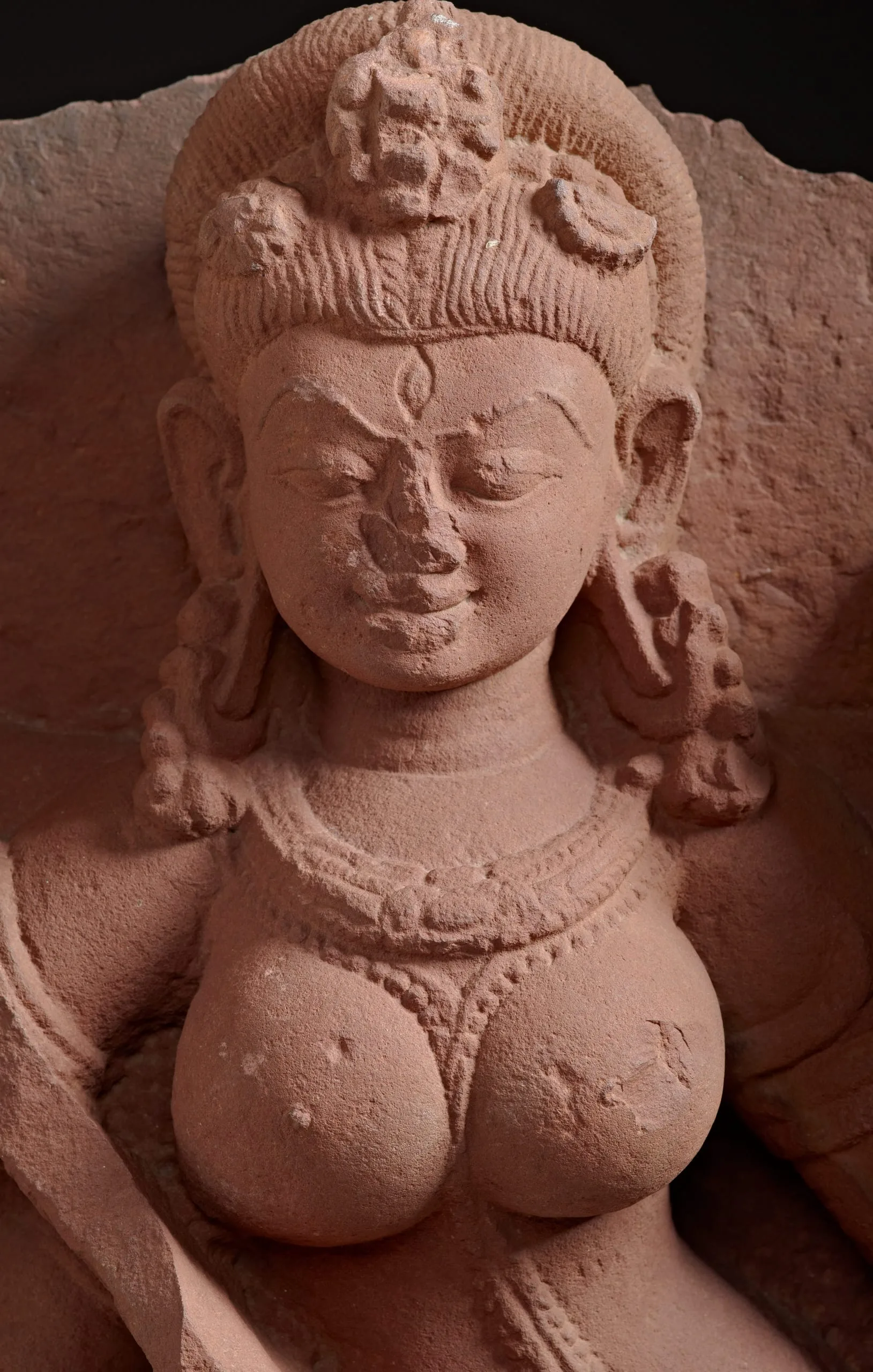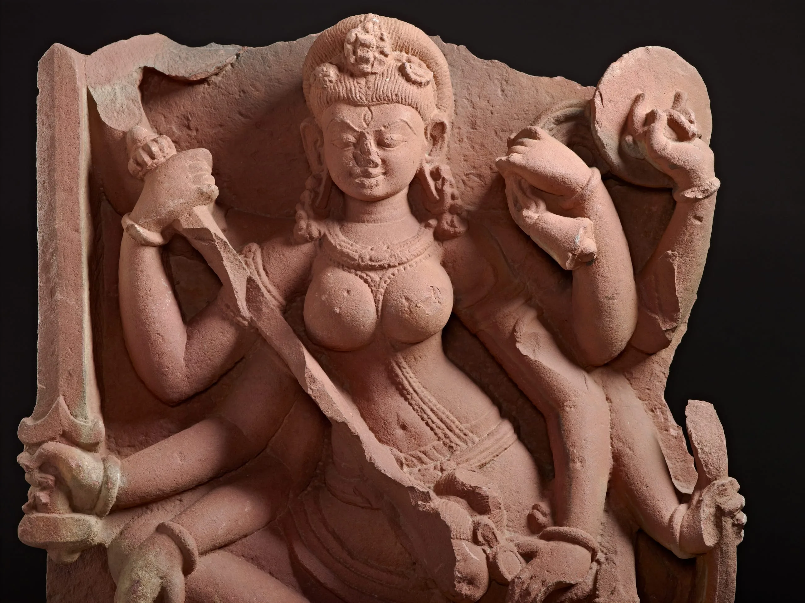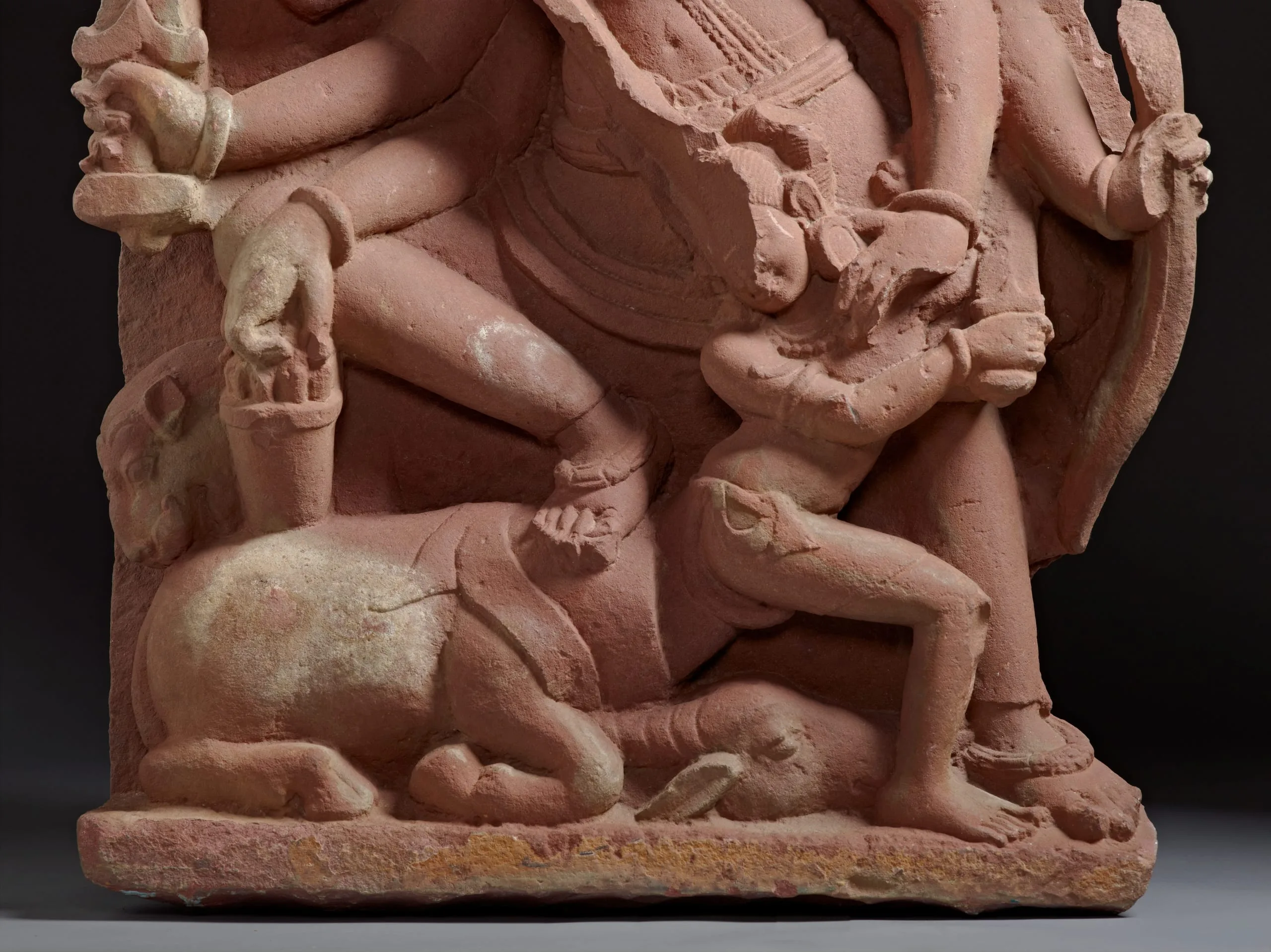 In this stark 9th-century western Indian image, the act of slaying the demon is given the main emphasis. The medium of the stone is subverted to the message of the religious meaning and the spiritual power of the image is conveyed through the powerfully direct forms and relative lack of surface embellishment. By comparison, in an elaborate 13th-century southern Indian representation (M.70.1.1), the medium is the message. Its lavish ornamentation and richness of detail aptly convey the spiritual glory of the triumphant goddess.
