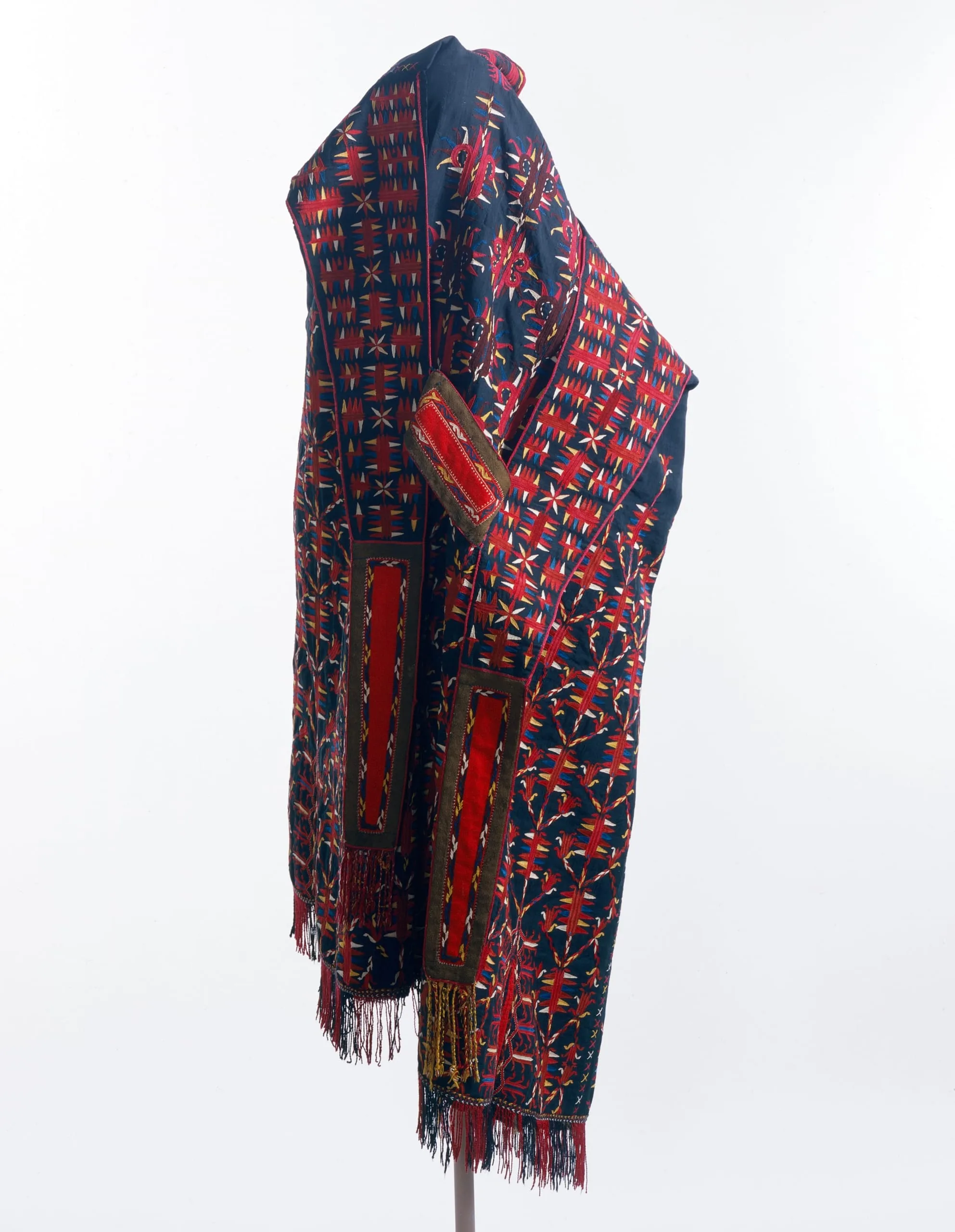 - Silk plain weave with silk embroidery, silk fringe, wool plain weave, silk cord, wool twill