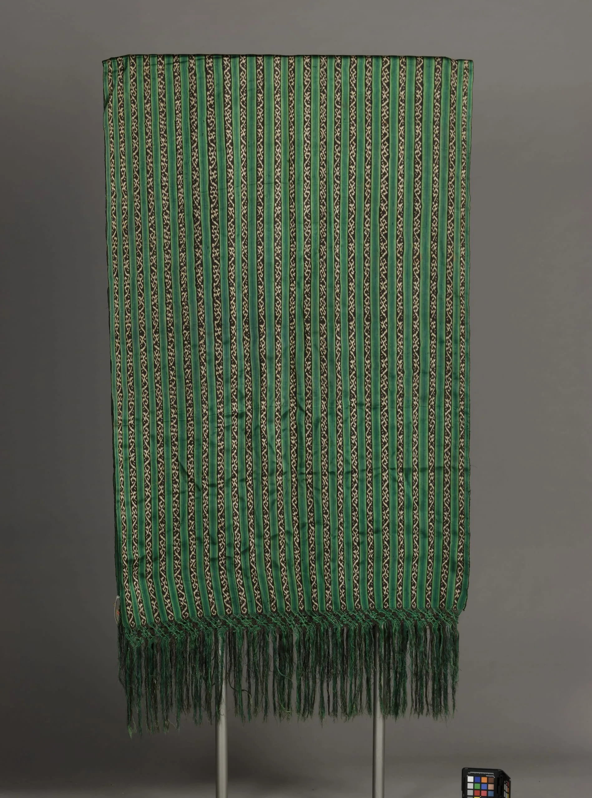 - Silk plain weave with tie-resist dyed warps (ikat) and silk macramé and fringe