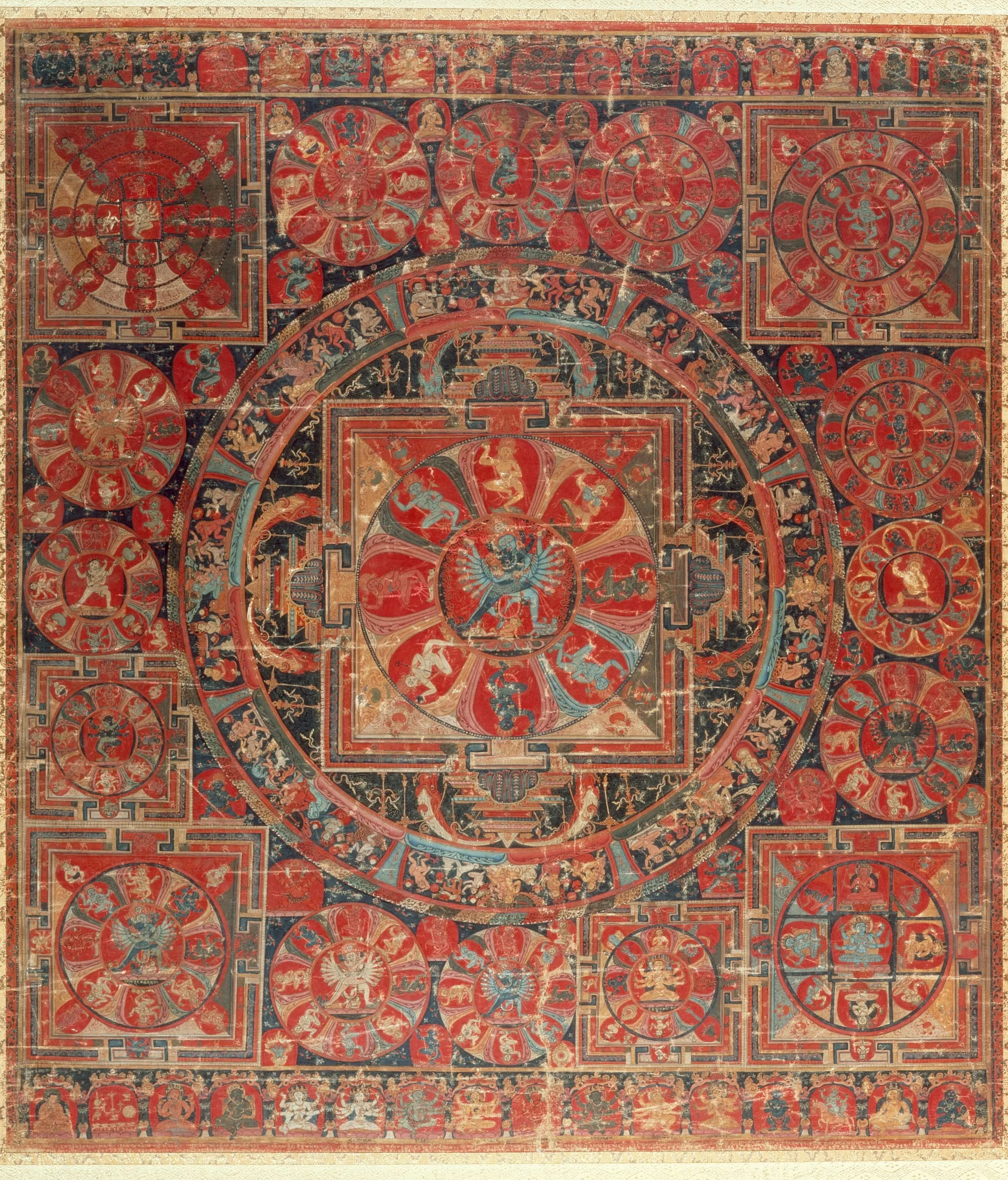 In this complex painting created as an aid to meditation, sixteen different mandalas dedicated to the deity Hevajra, the personification of the Hevajra Tantra, surround a central mandala. In the center, Hevajra dances in ecstasy while embracing his consort Nairatmya, who symbolizes wisdom (prajna). Hevajra is depicted as a cosmic god with eight heads and sixteen arms, each of which holds a skull-cup containing an animal or deity. The four enemies of enlightenment who Hevajra tramples beneath his feet are the Hindu gods Brahma, Vishnu, Shiva, and Indra. On the eight petals of the central lotus are dancing figures of the goddesses who emerge from the union of the principal pair: Gauri, Chauri, Vetali, Ghasmari, Pukkasi, Savari, Chandali, and Dombini. Outside of the ring of female deities are the four "gates to the palace." All the mandalas are conceived of as a palace symbolizing knowledge (jnana). The outer circle of the central mandala depicts the eight cemeteries or cremation grounds.