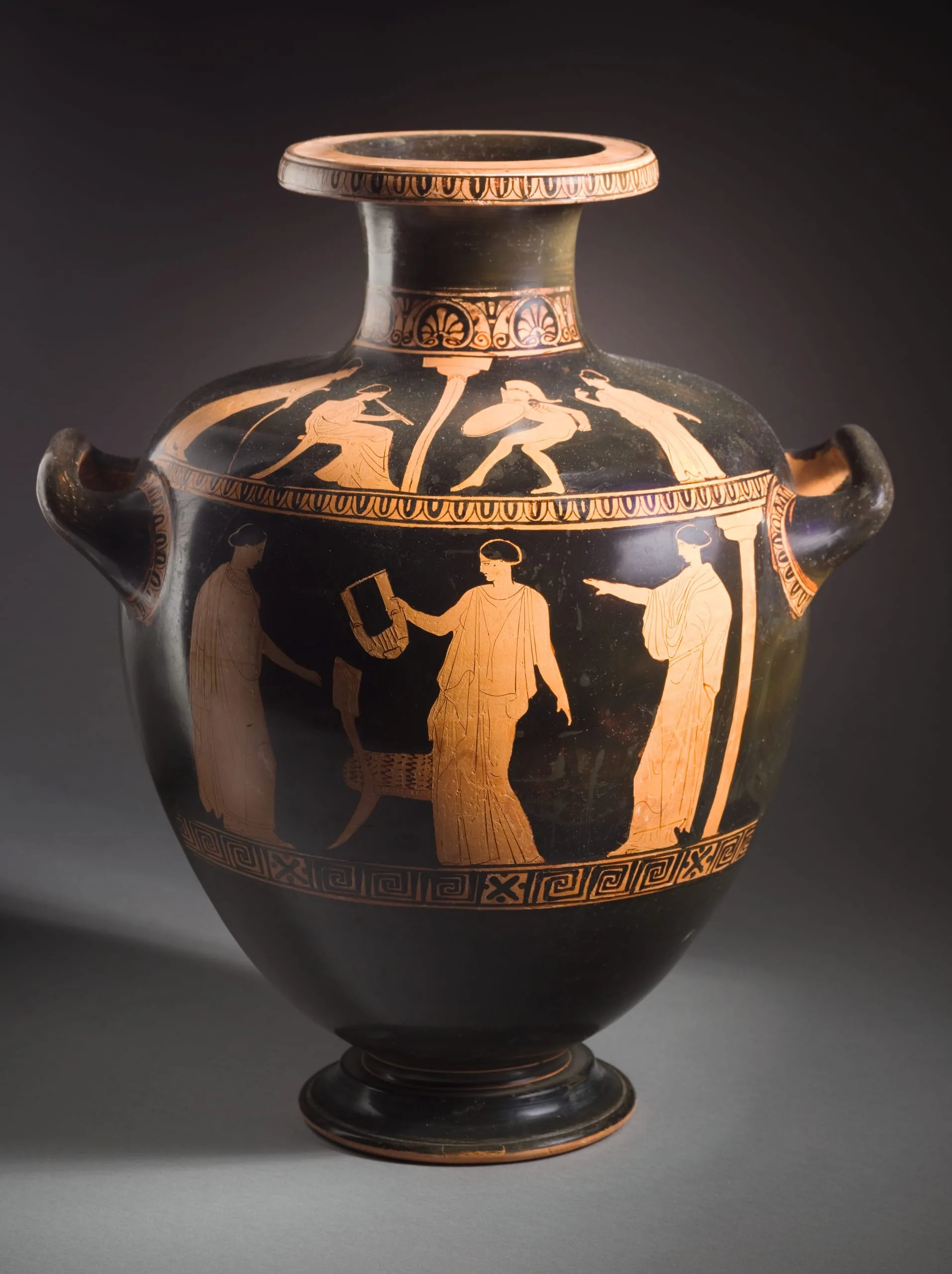 Group of Polygnotos (attributed to the), Red-Figure Hydria with (shoulder) a Dancing Warrior, Accompanied by a Woman Playing the Pipes, and (body) Two Women Facing a Woman Holding a Kithara, circa 440 B.C. | LACMA Collections