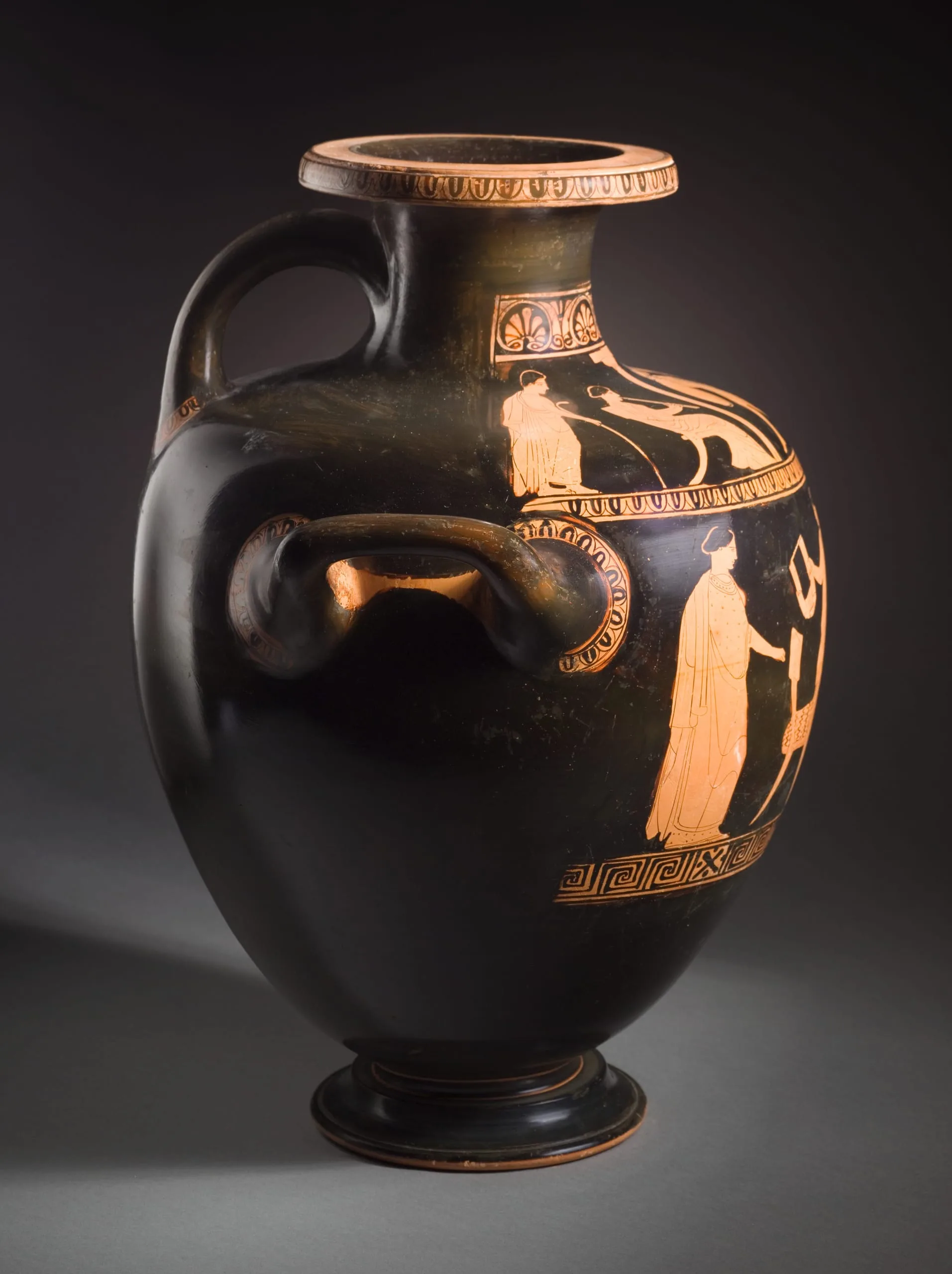 Red-Figure Hydria with (shoulder) a Dancing Warrior, Accompanied by a Woman Playing the Pipes, and (body) Two Women Facing a Woman Holding a Kitharacirca 440 B.C.