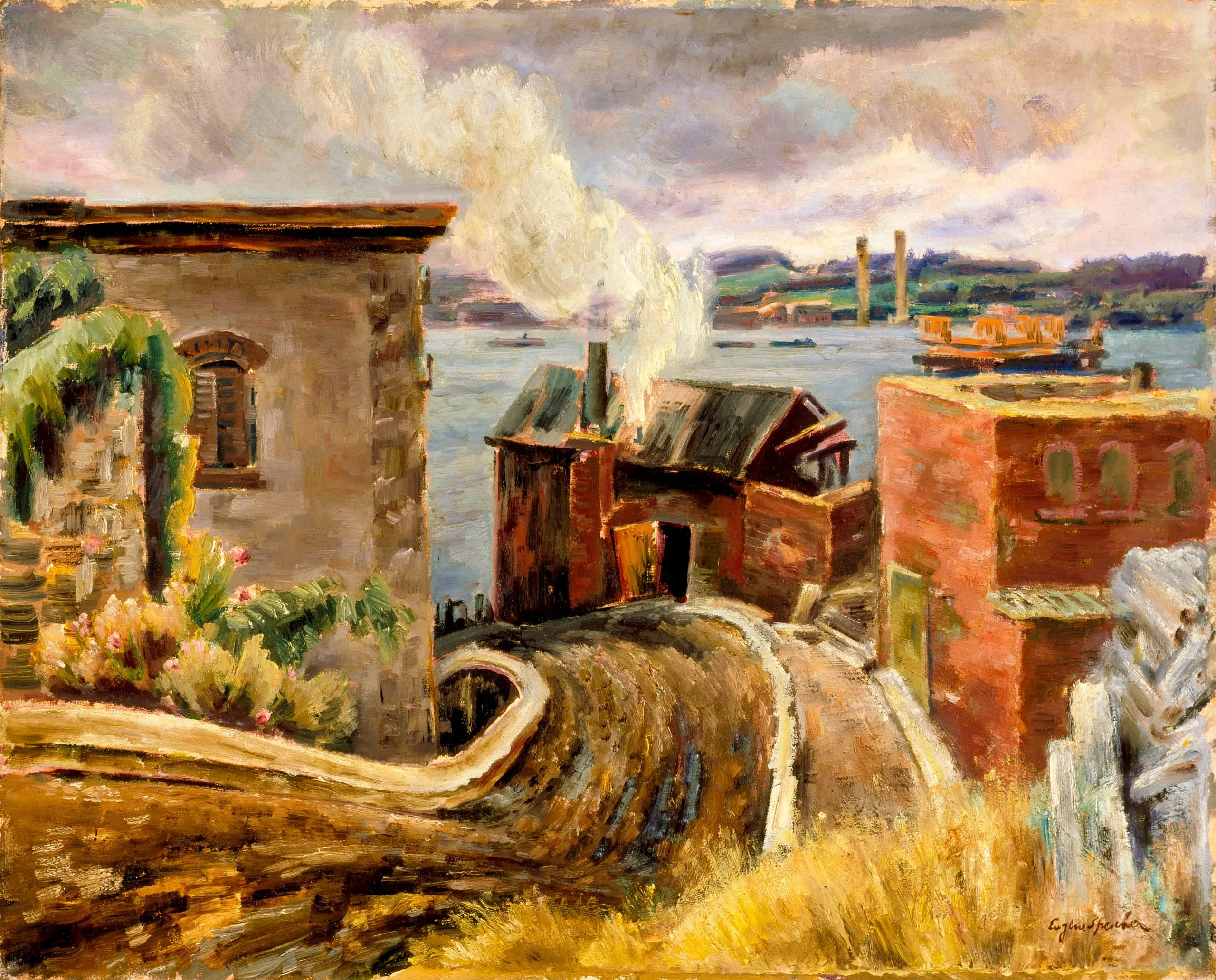 This painting probably dates from the 1920s, perhaps the later part of the decade, as indicated by the similarity of its brushwork to that in dated landscapes from that period or later. A dating to the 1920s would coincide with the period when George Bellows, a close friend of Speicher’s, was working at Woodstock, which also may explain the vigor of the brushwork. The warehouse and ramshackle buildings are presented as simplified geometric forms built up with short, heavy, staccato brushstrokes of opaque paint. While the overall palette is somber to convey the drabness of the town’s riverfront, it is enlivened with passages of warm rose and orange hues. Speicher retained some of Henri’s and Bellows’s rich color sense in his use of lavender, pink, and blue in the cloudy, gray sky.