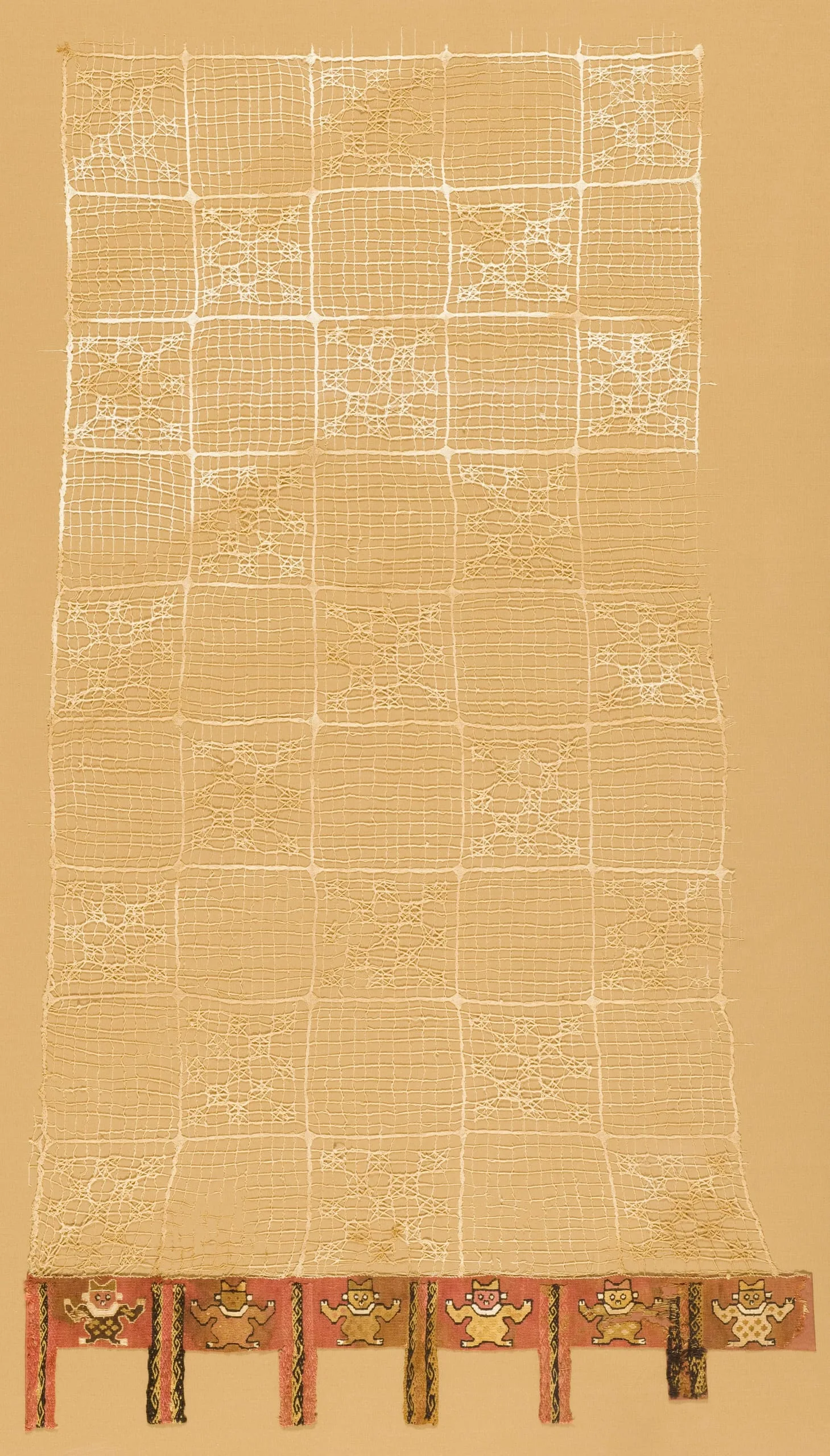 - Camelid fiber and cotton, open weave with embroidery, with attached weft-faced slit tapestry band with sections of weft becoming warp-faced tapestry fringe
